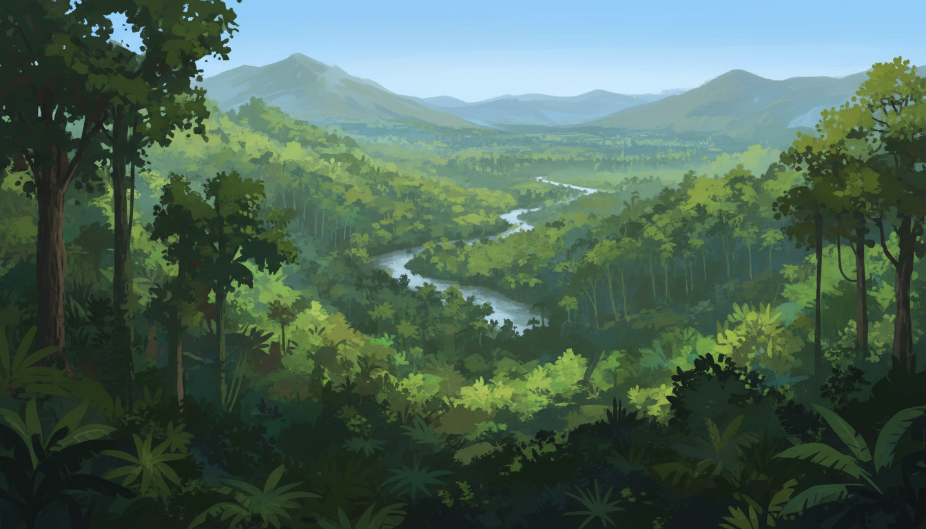 大河と山々を望むジャングル風景|広大な熱帯雨林背景イラスト素材