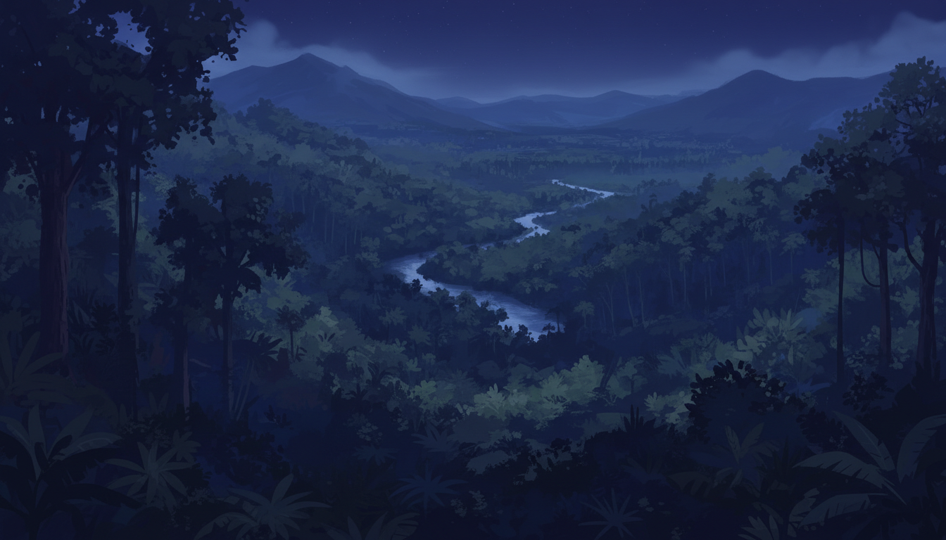 月夜に包まれた山と川の風景を描いた、落ち着いた雰囲気のジャングル背景イラスト素材です。