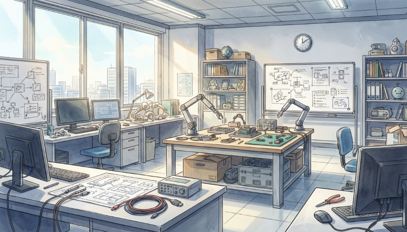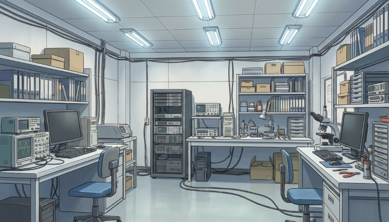 測定器や回路基板が揃った研究室で、工学・IT系の専門的なシーンに最適です。