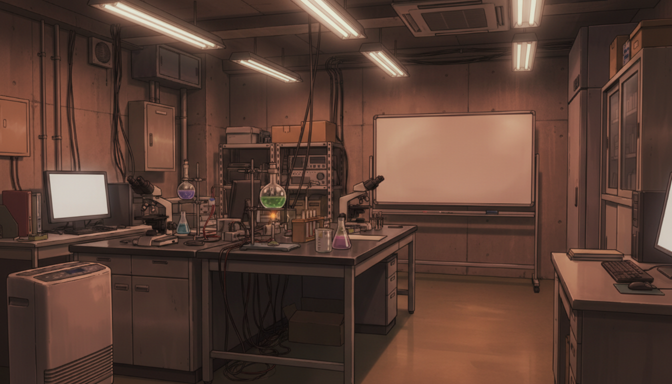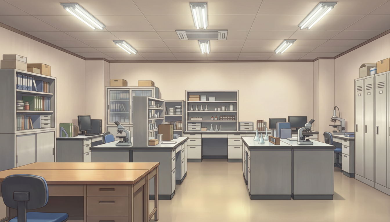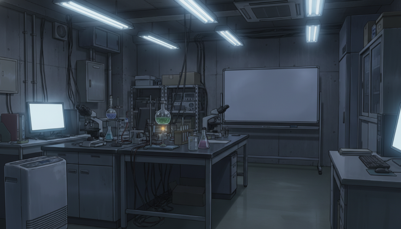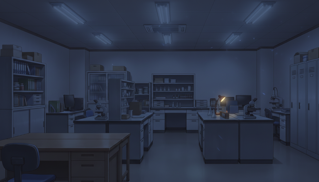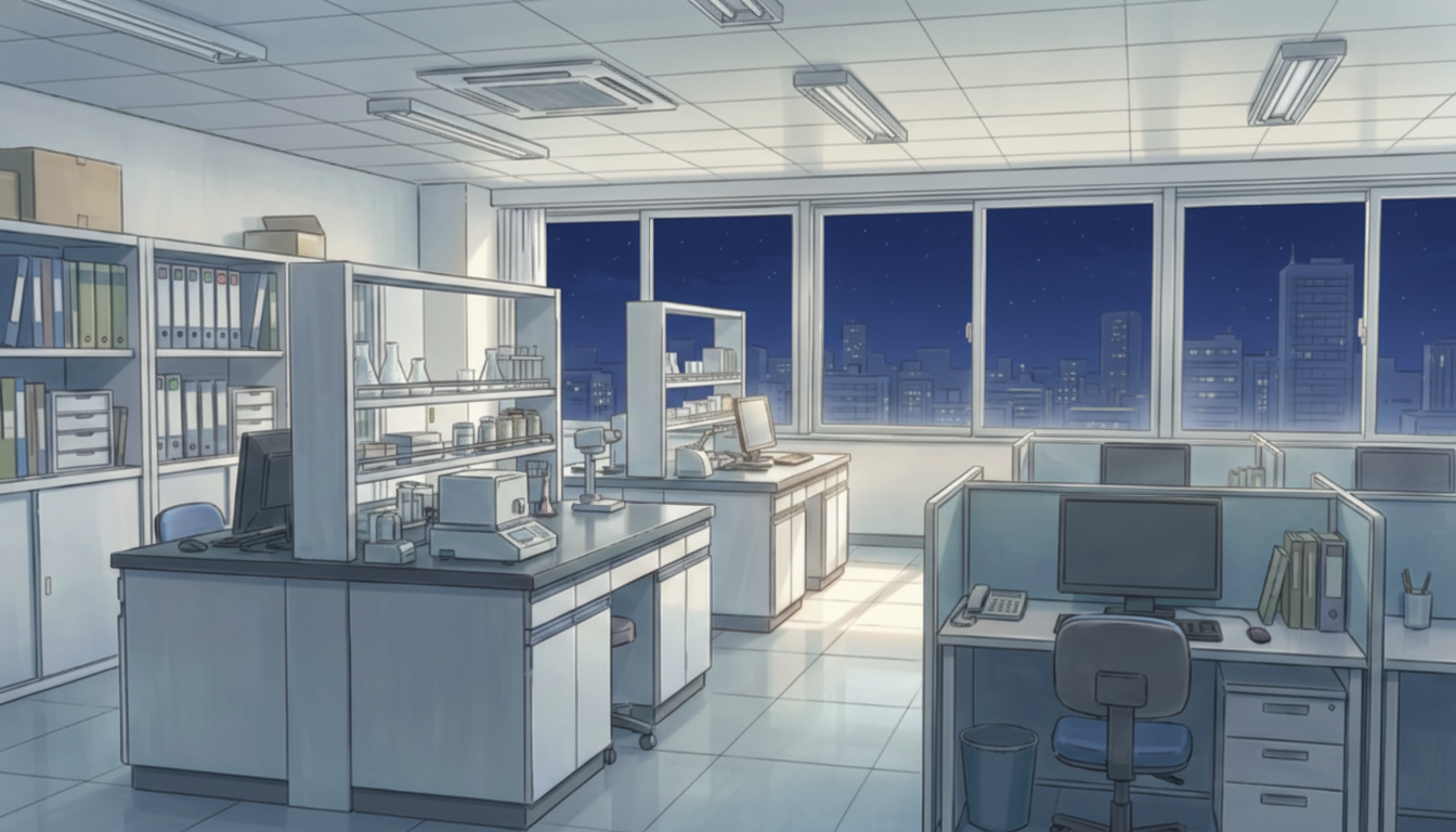 白色灯だけが照らす研究室で、緊張感のある深夜実験シーンに適しています。