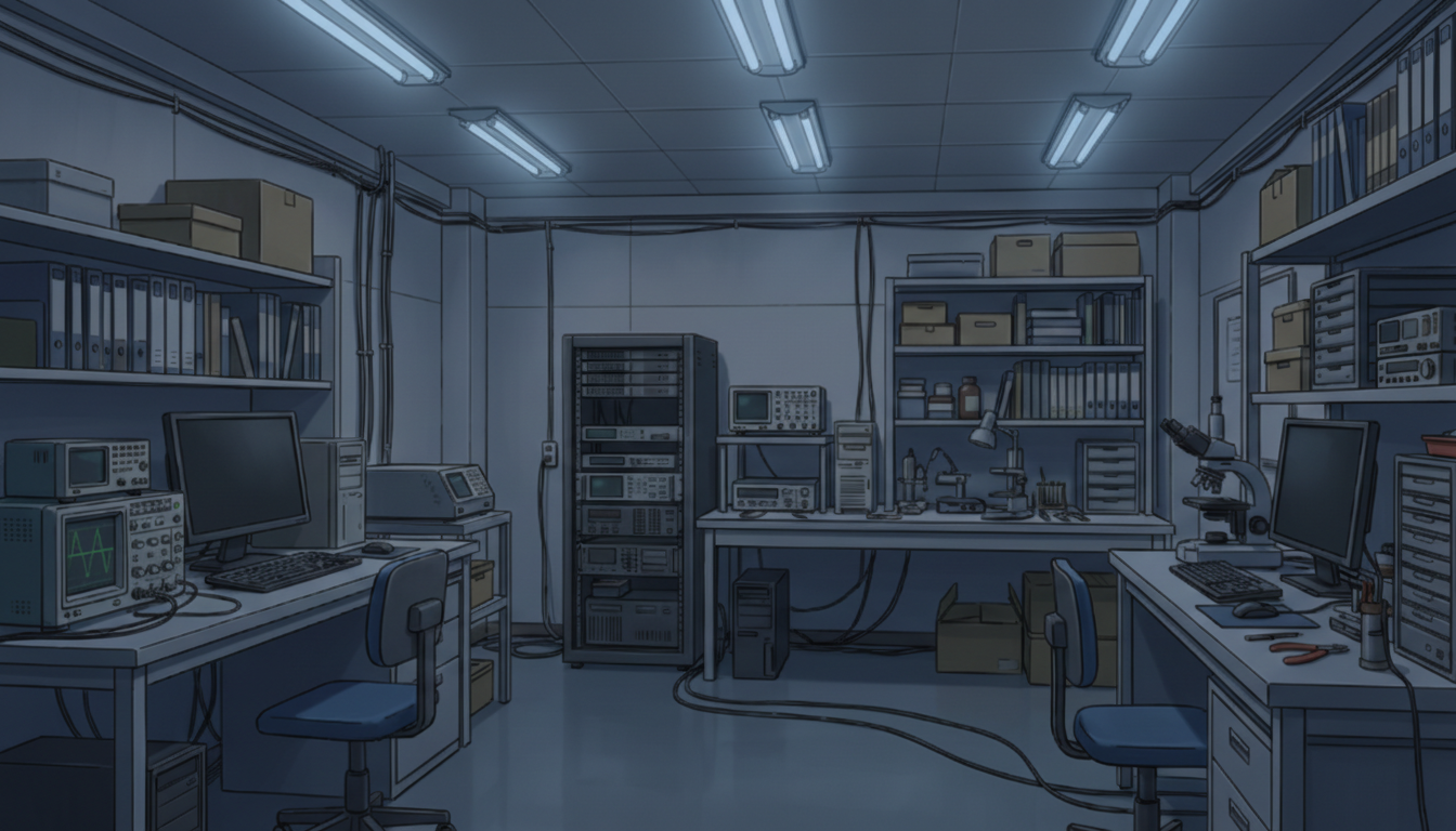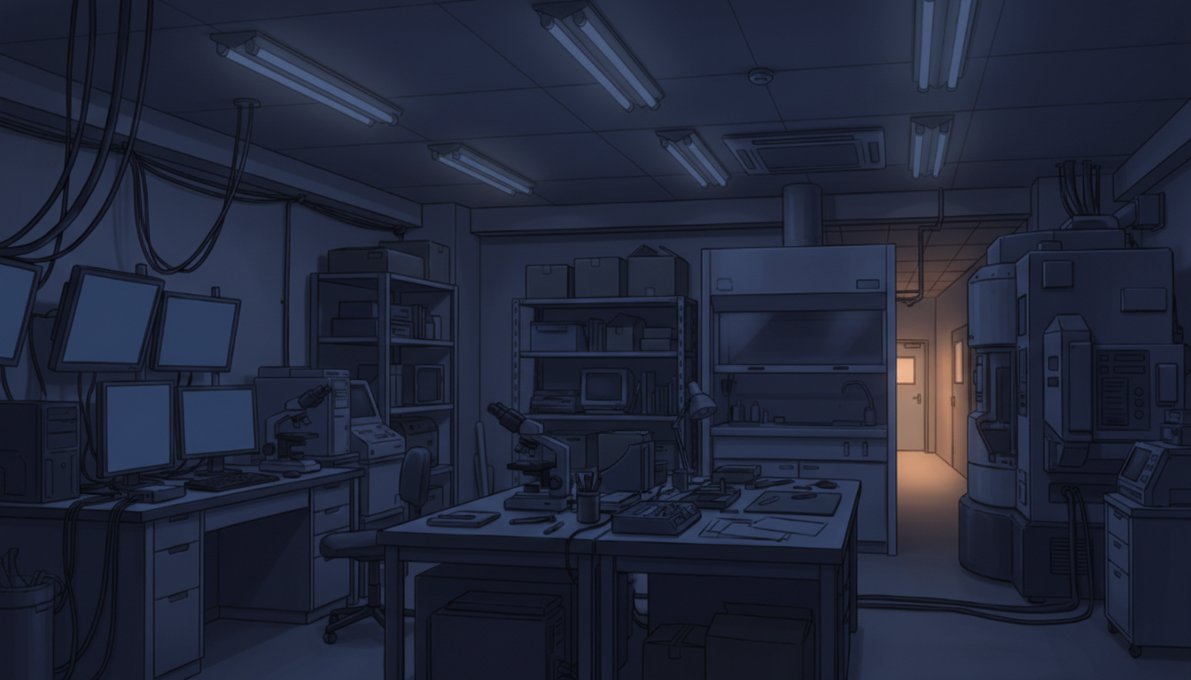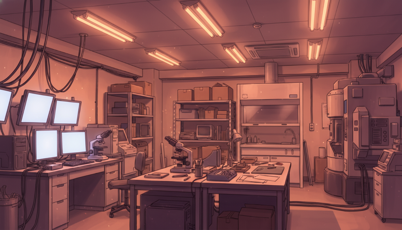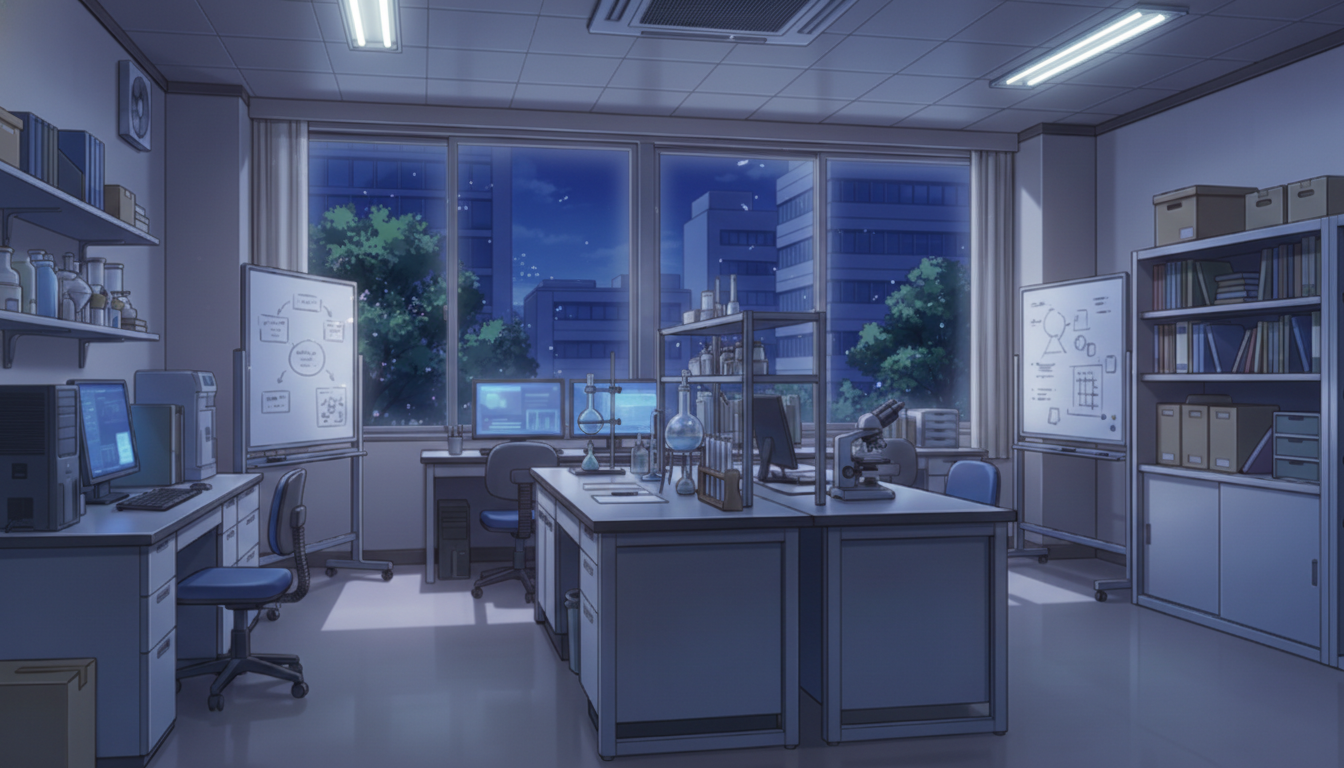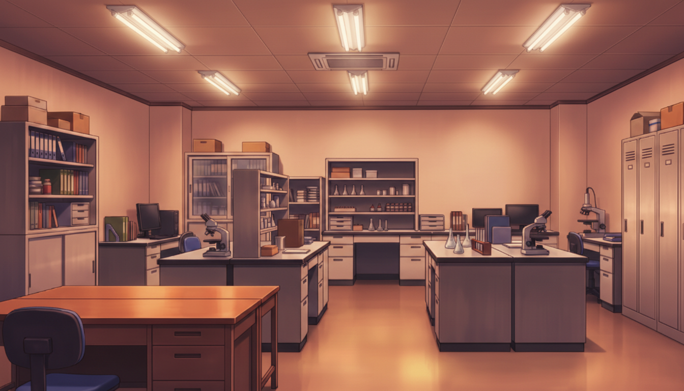 白色灯だけが照らす研究室で、緊張感のある深夜実験シーンに適しています。