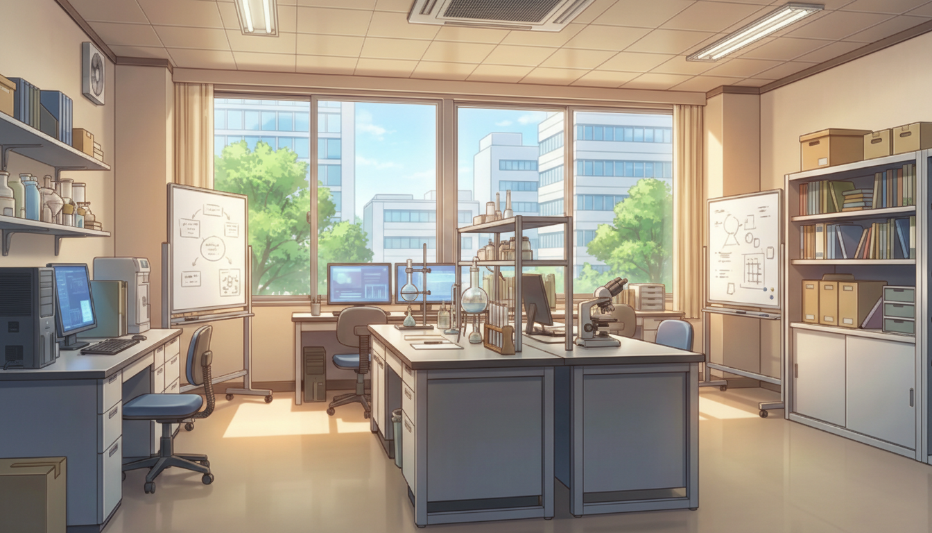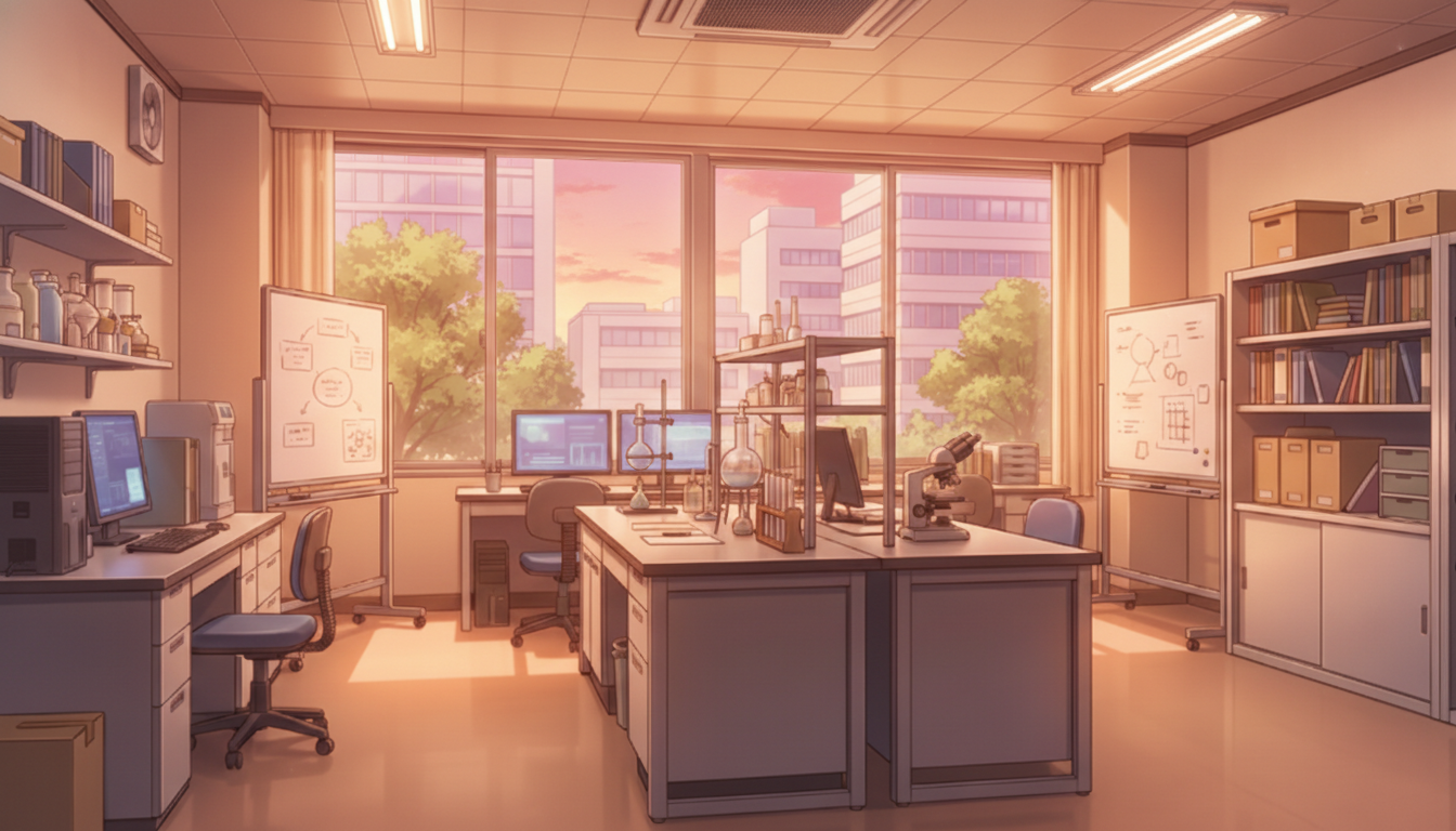 柔らかな夕方の光が差し込み、日常的な研究室の一コマを演出します。
