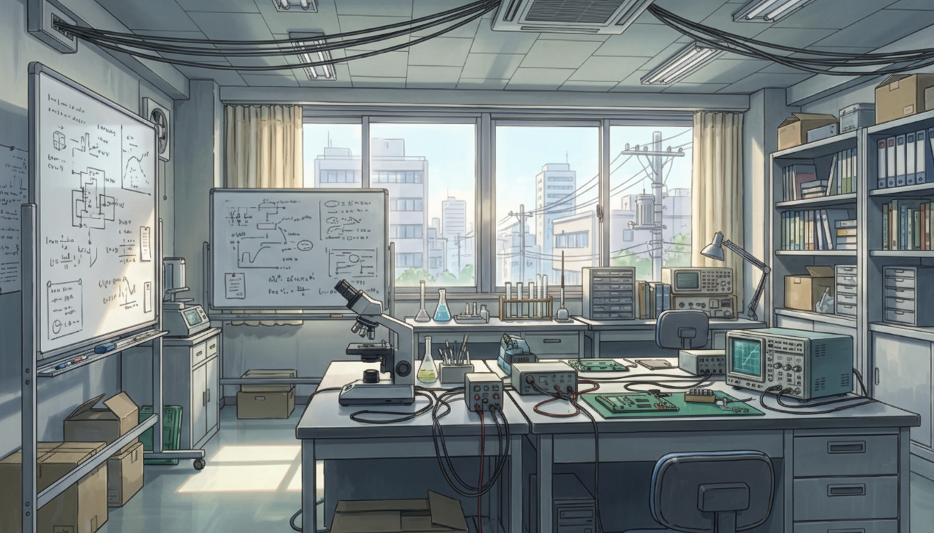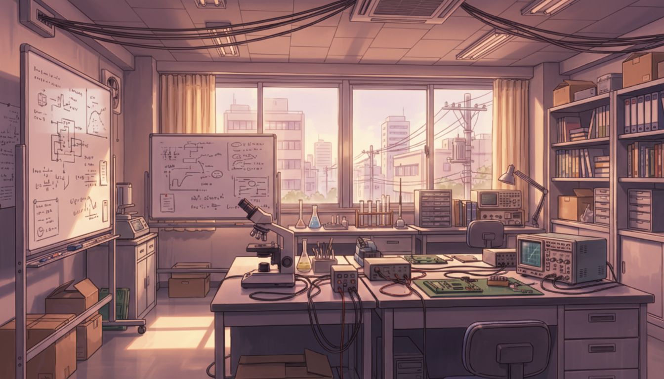 夕方の光が差し込む研究室で、回路設計や計測作業の雰囲気を自然に表現できます。