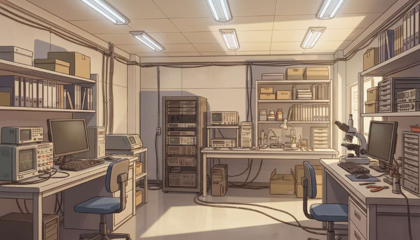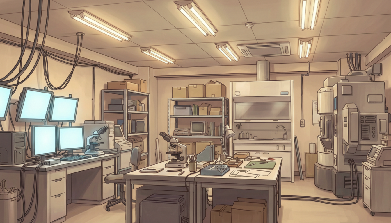 夕暮れの照明が機材を照らし、落ち着いた研究時間を表現できます。