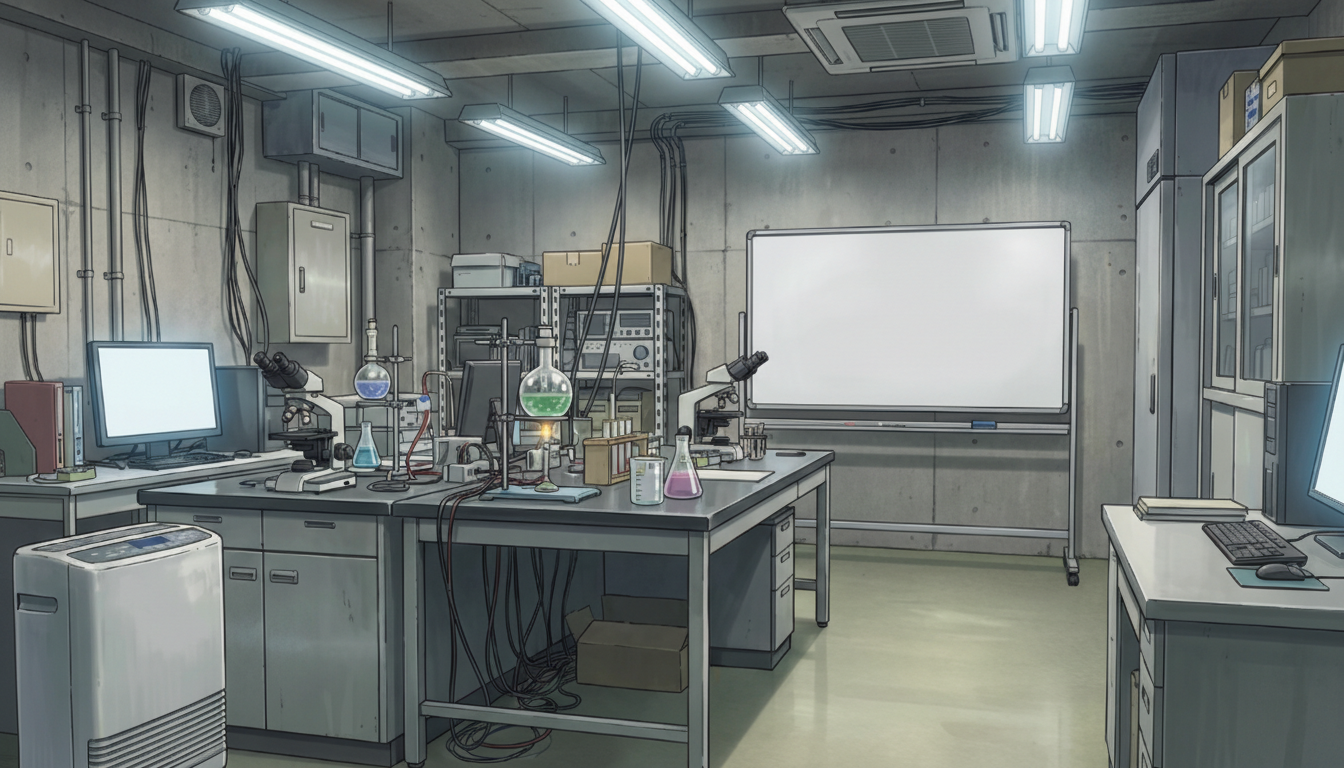 昼の無機質な研究室|コンクリート壁の実験空間