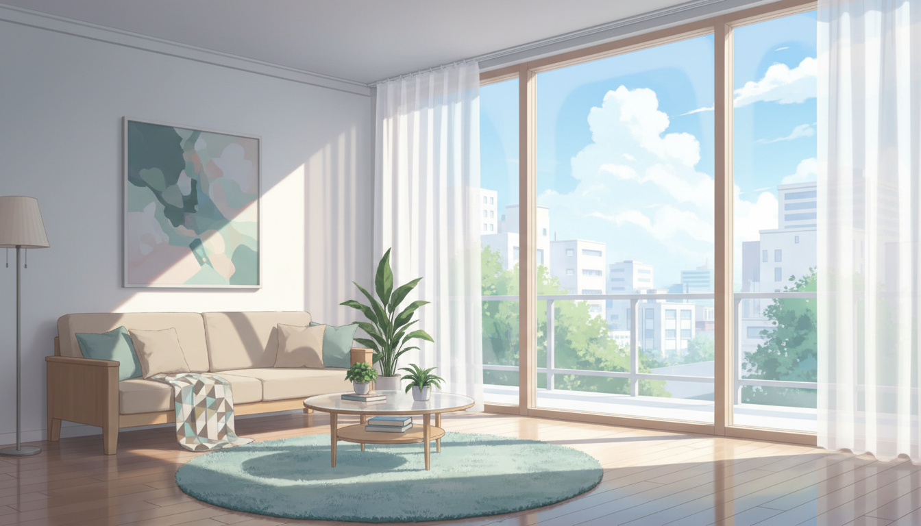 朝の光が差し込むリビングルーム|爽やかな一日の始まり