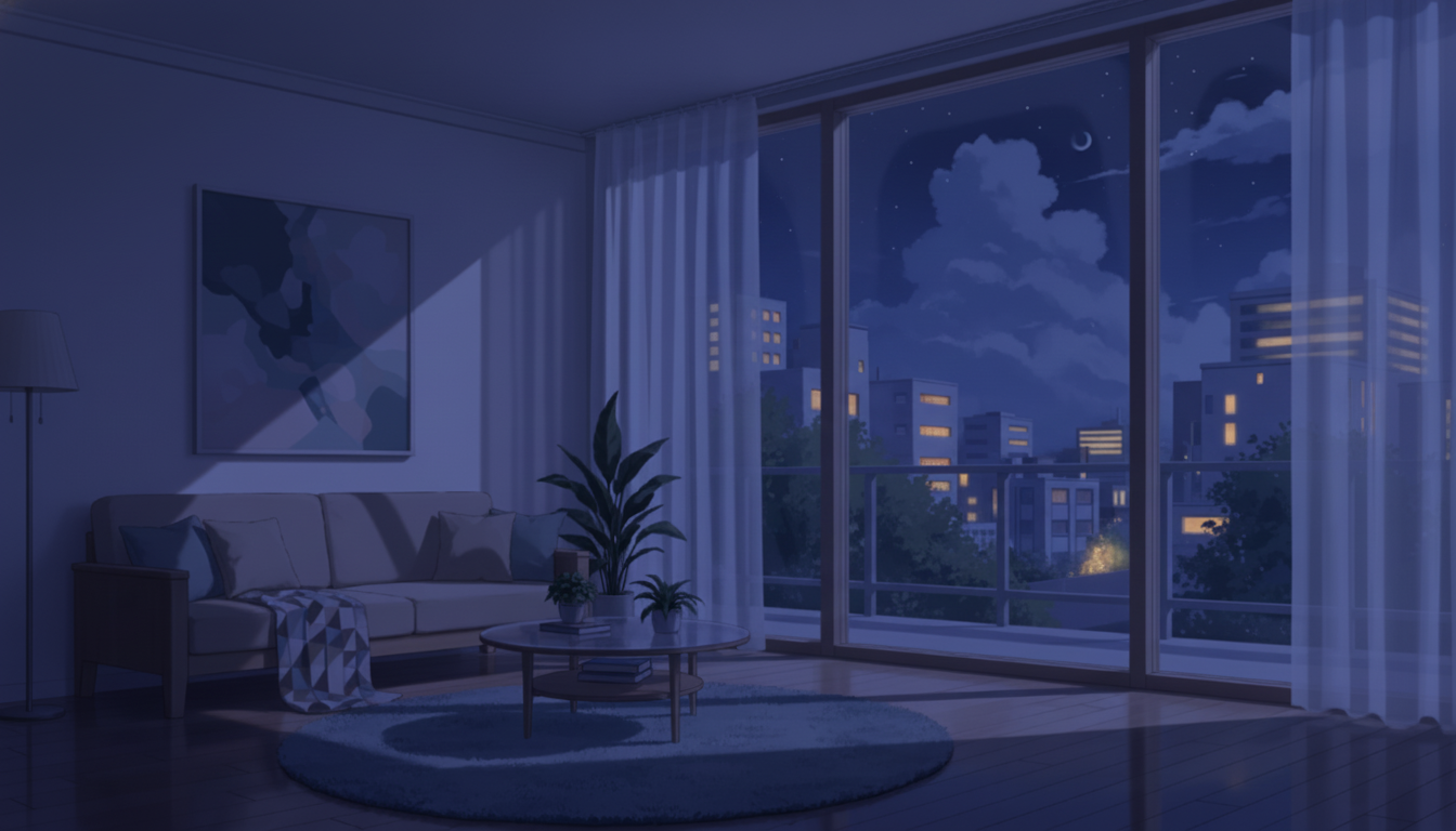 夜の静かなリビングルーム|星明かりのくつろぎ空間