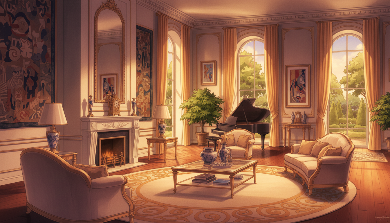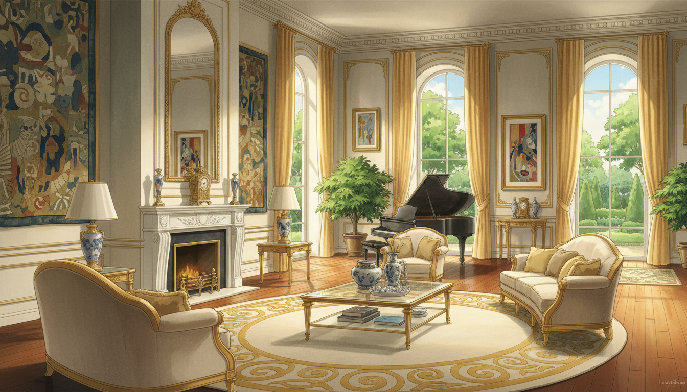 格式ある装飾と大窓の光が映え、上品な応接・邸宅シーンを演出する背景です。