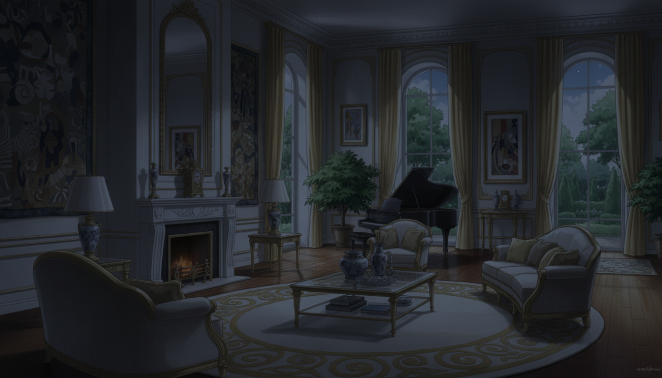 夜のクラシックサロン|暖炉の残り火と静かな邸宅