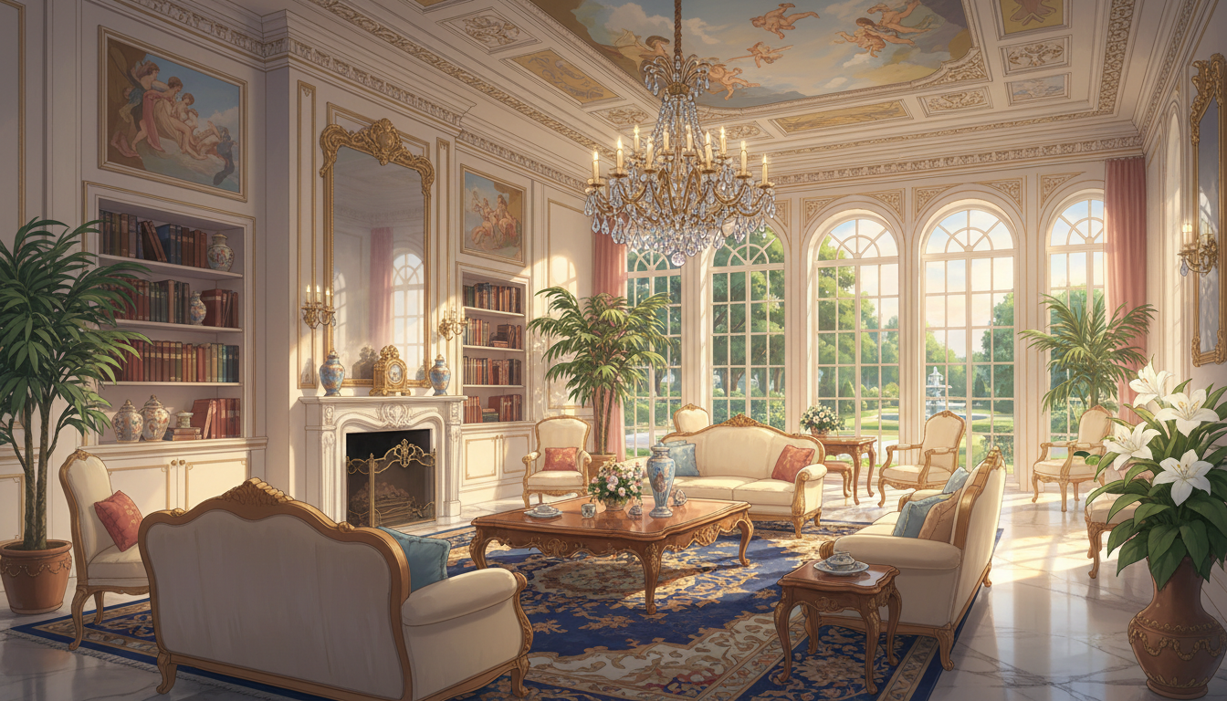 宮殿の大広間リビング|シャンデリアと庭園ビュー