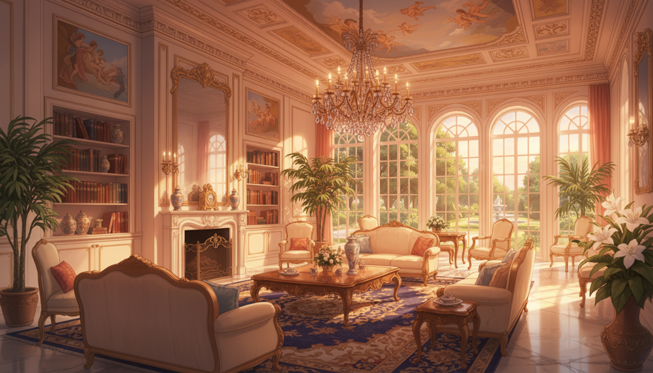 夕陽の宮殿リビング|黄金に染まるシャンデリアホール