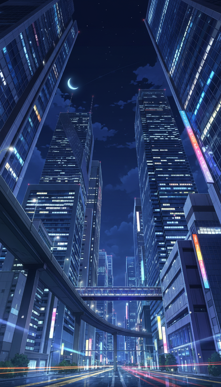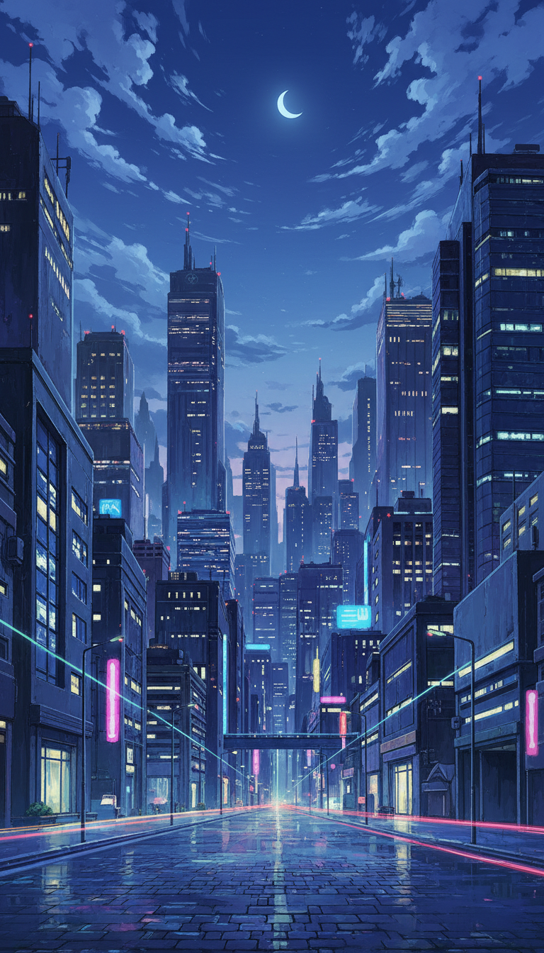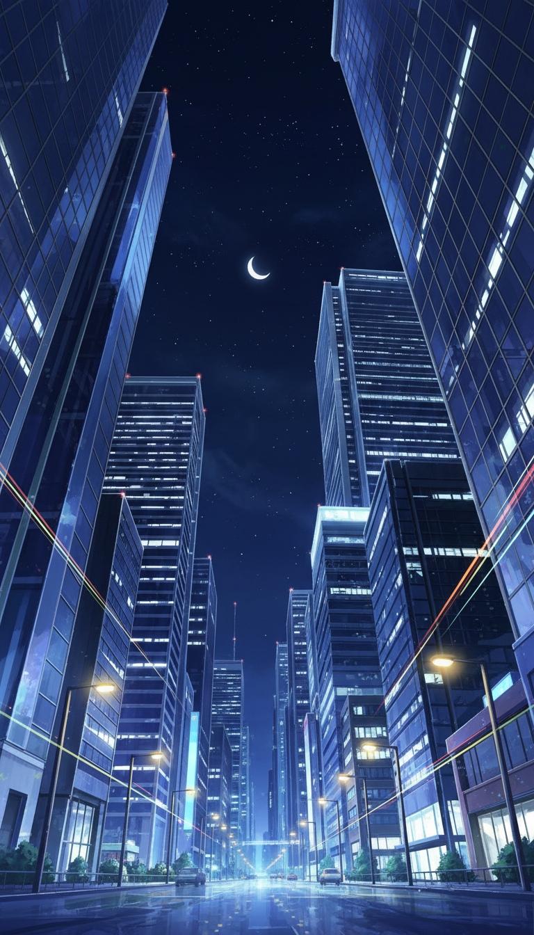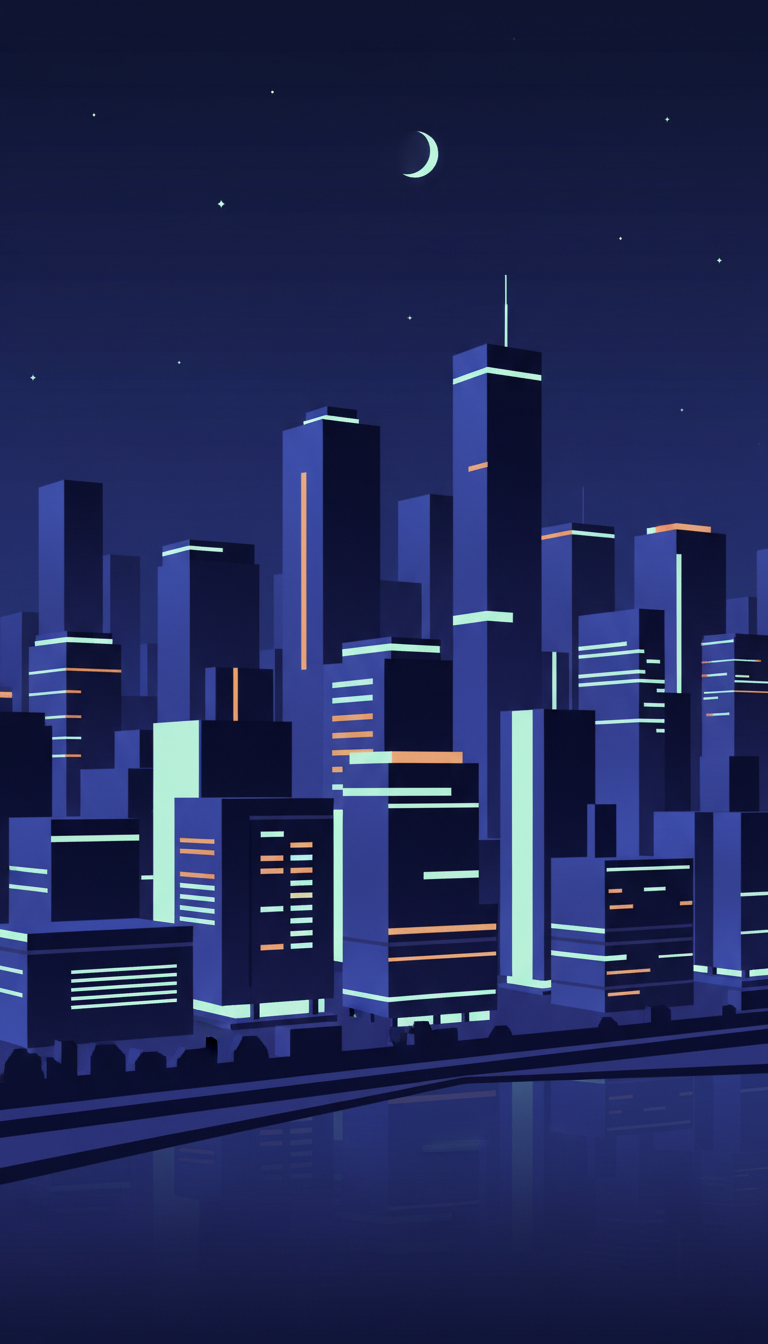 ミニマル都市スカイライン夜景|三日月とネオンの抽象ビル群