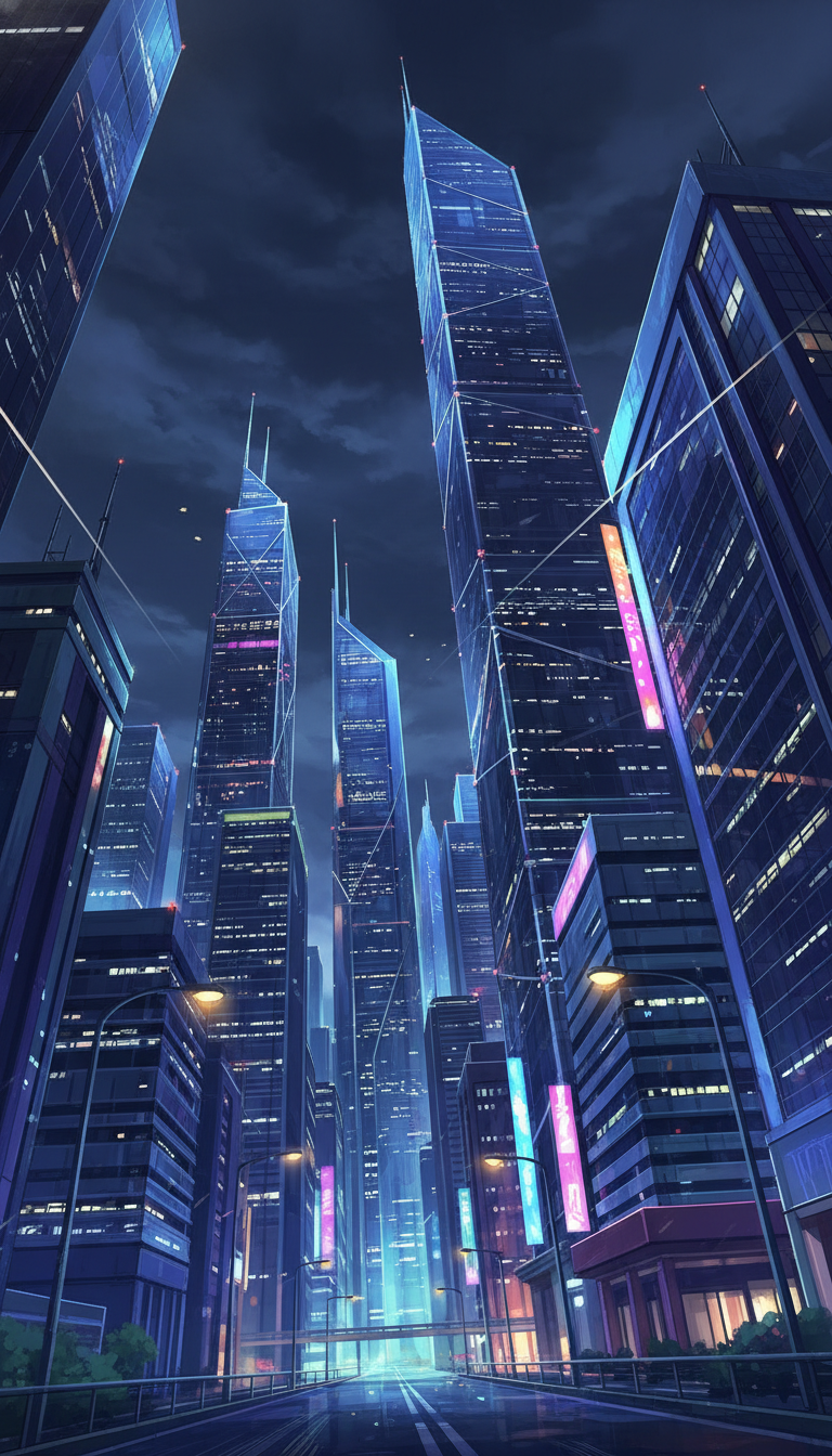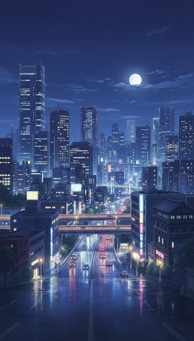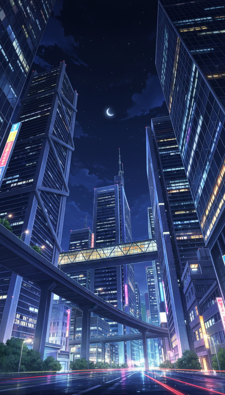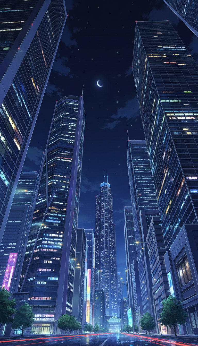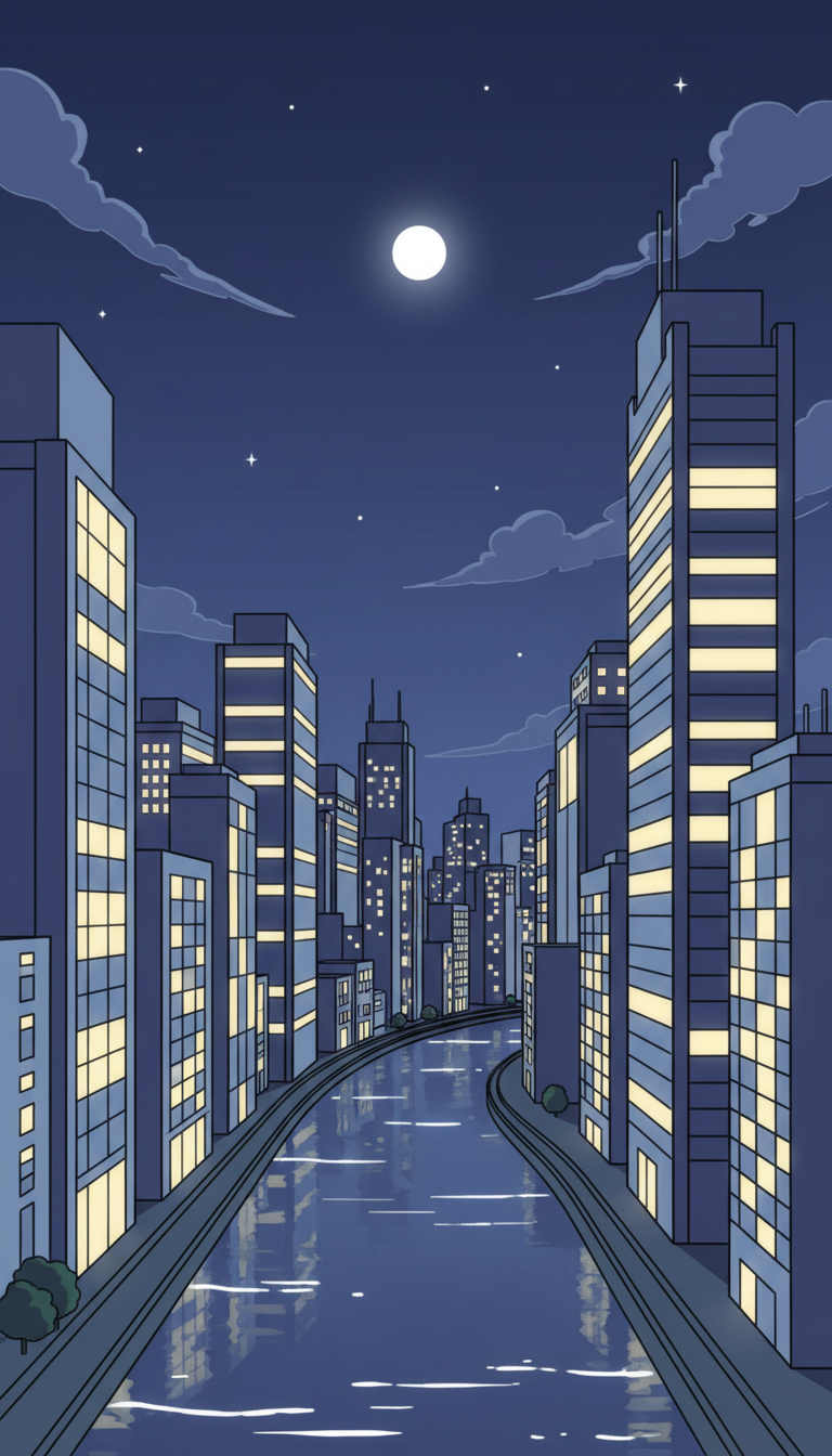 夜景の背景イラスト素材を無料配布。9:16の縦長構図でスマホ作品に使いやすい背景イラストです。漫画・Webtoonやゲーム背景として商用・トレース利用もOK!