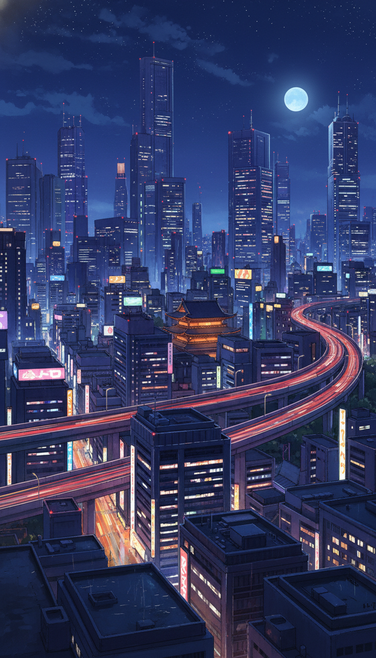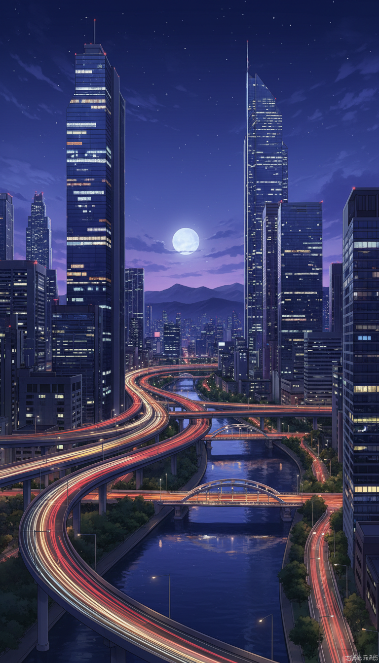 湾曲する高架と満月の夜景|水都を見下ろすタワー群