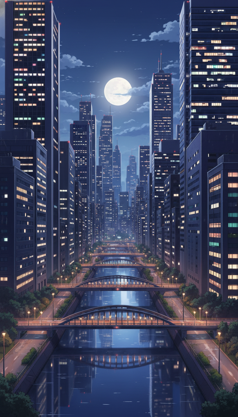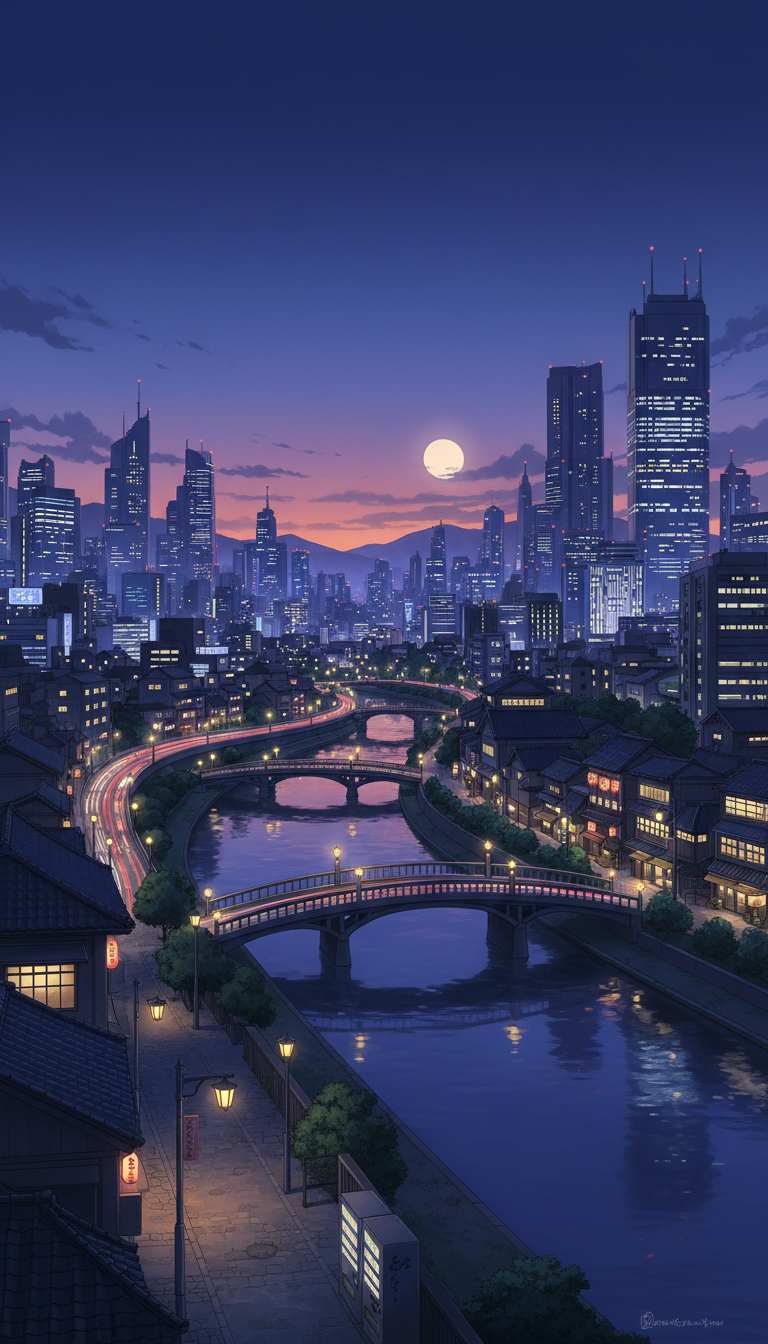 満月の光を受けた水面とリズミカルに連なる橋が、落ち着いた都会の情景を美しく映します。
