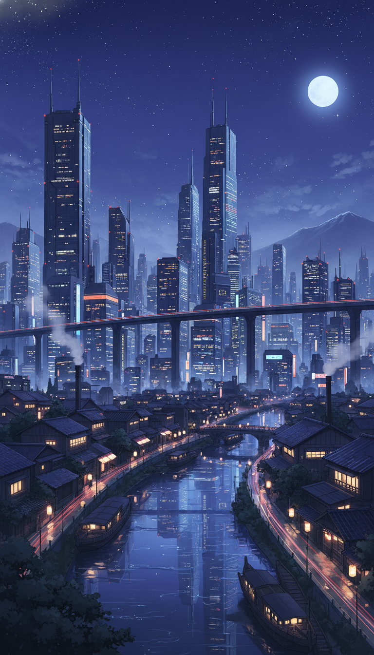運河と高架橋のレトロモダン夜景|舟と町家の灯り