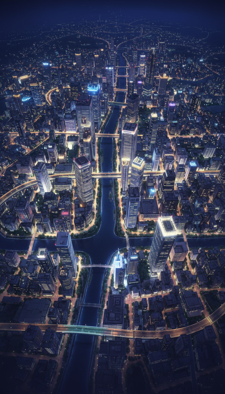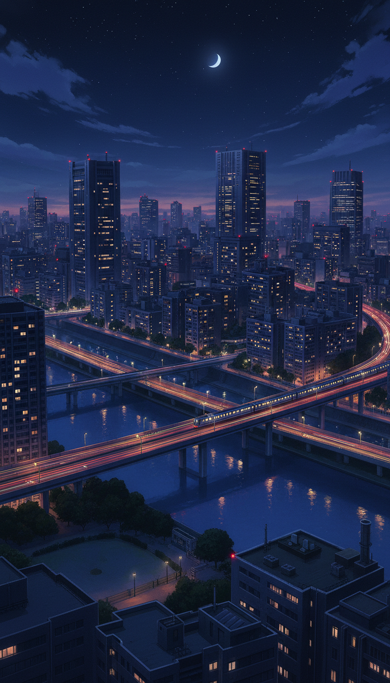静かな川面にビルの灯りが映り込む、落ち着いたナイトシティの雰囲気を表現します。