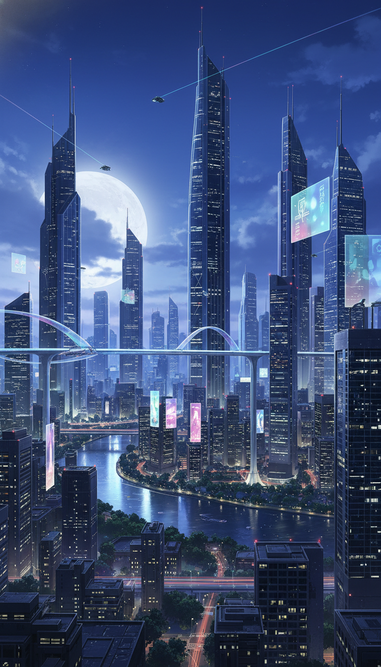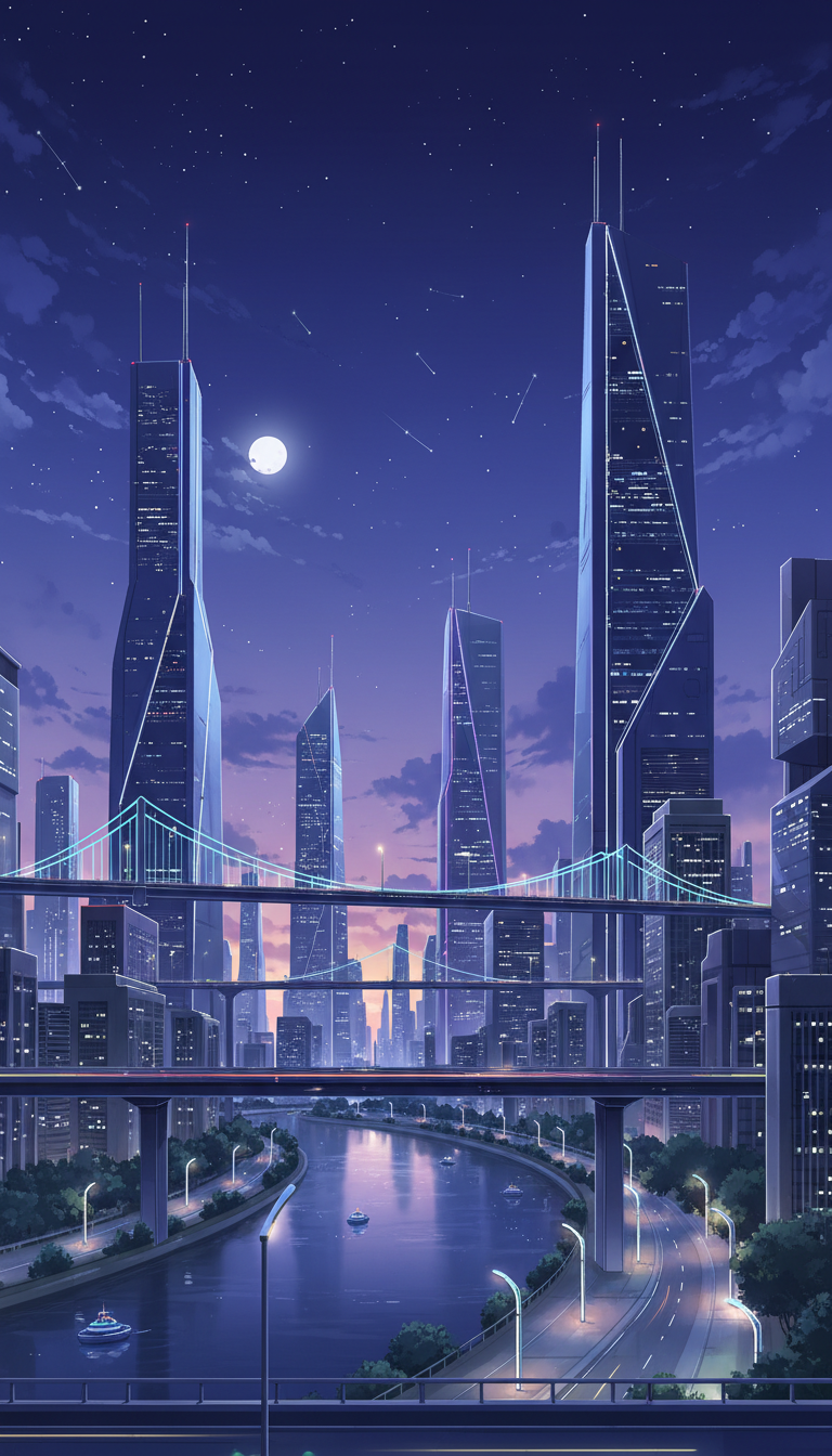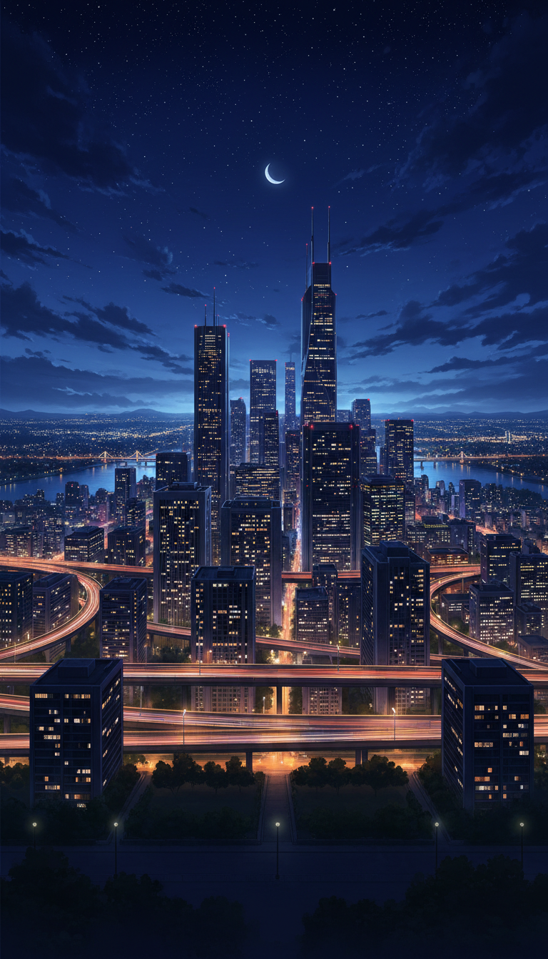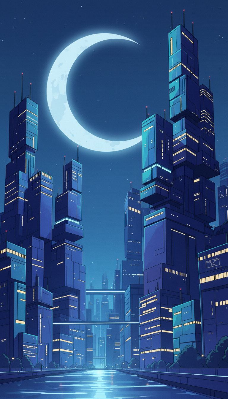 大きな三日月と直線的な高層群が印象的で、SF感のある都会の夜を演出します。