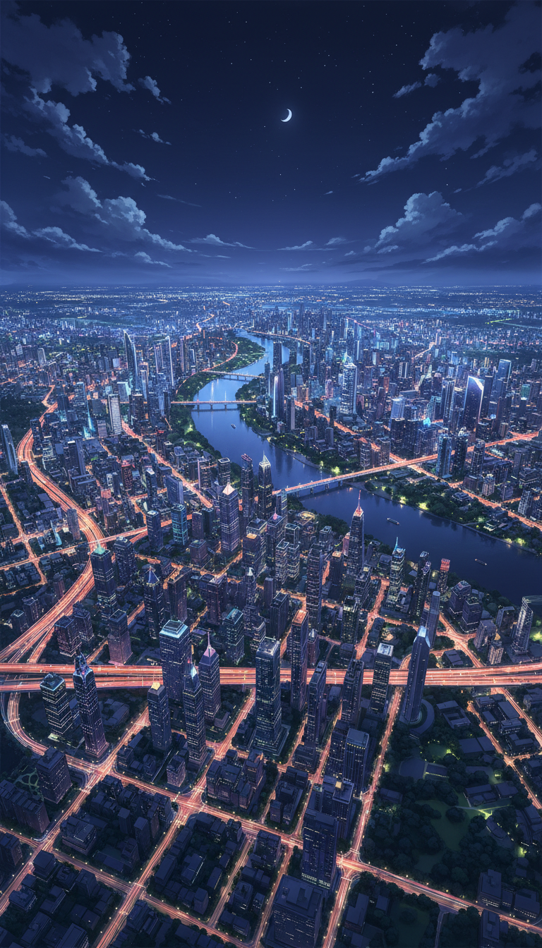俯瞰都市夜景イラスト|三日月と大河がうねるメガシティ