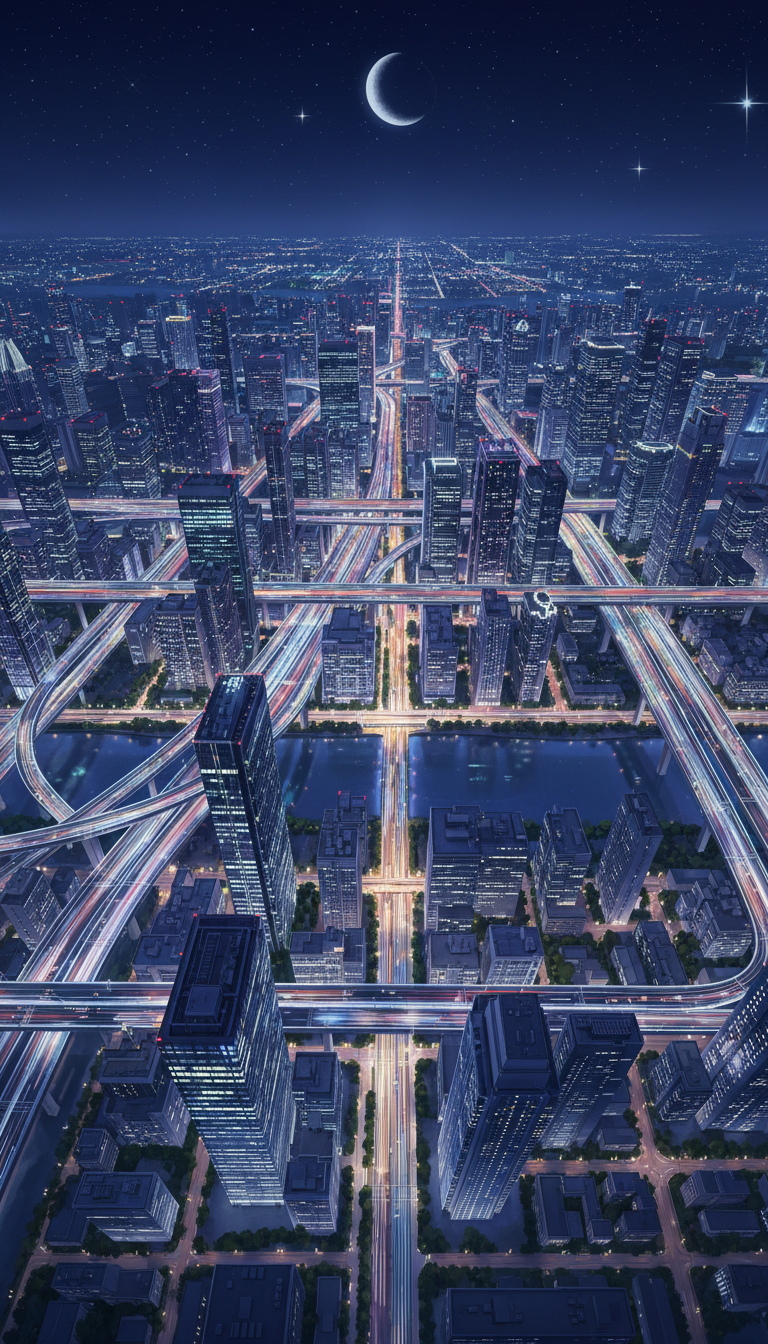 多層高架のメガシティ夜景|三日月と星空のスカイライン