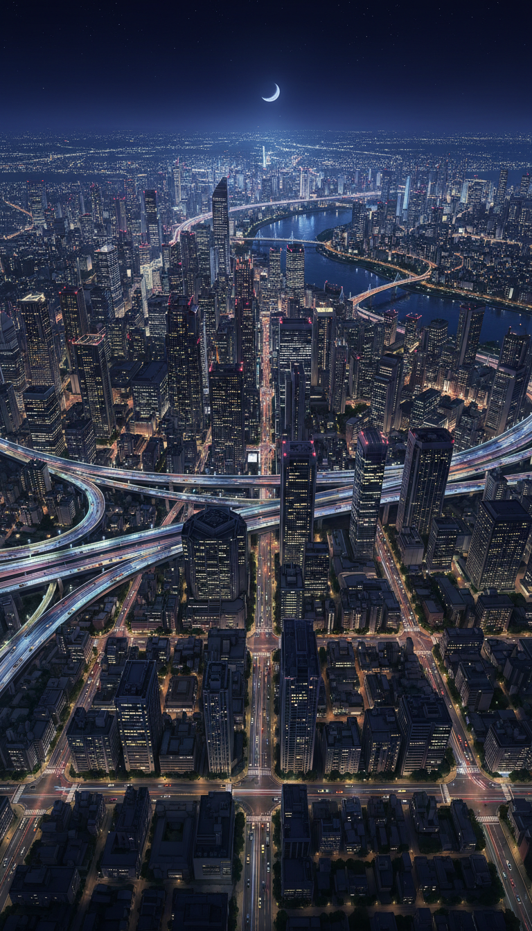 三日月と川のメトロポリス夜景|巨大高架と湾曲する流路
