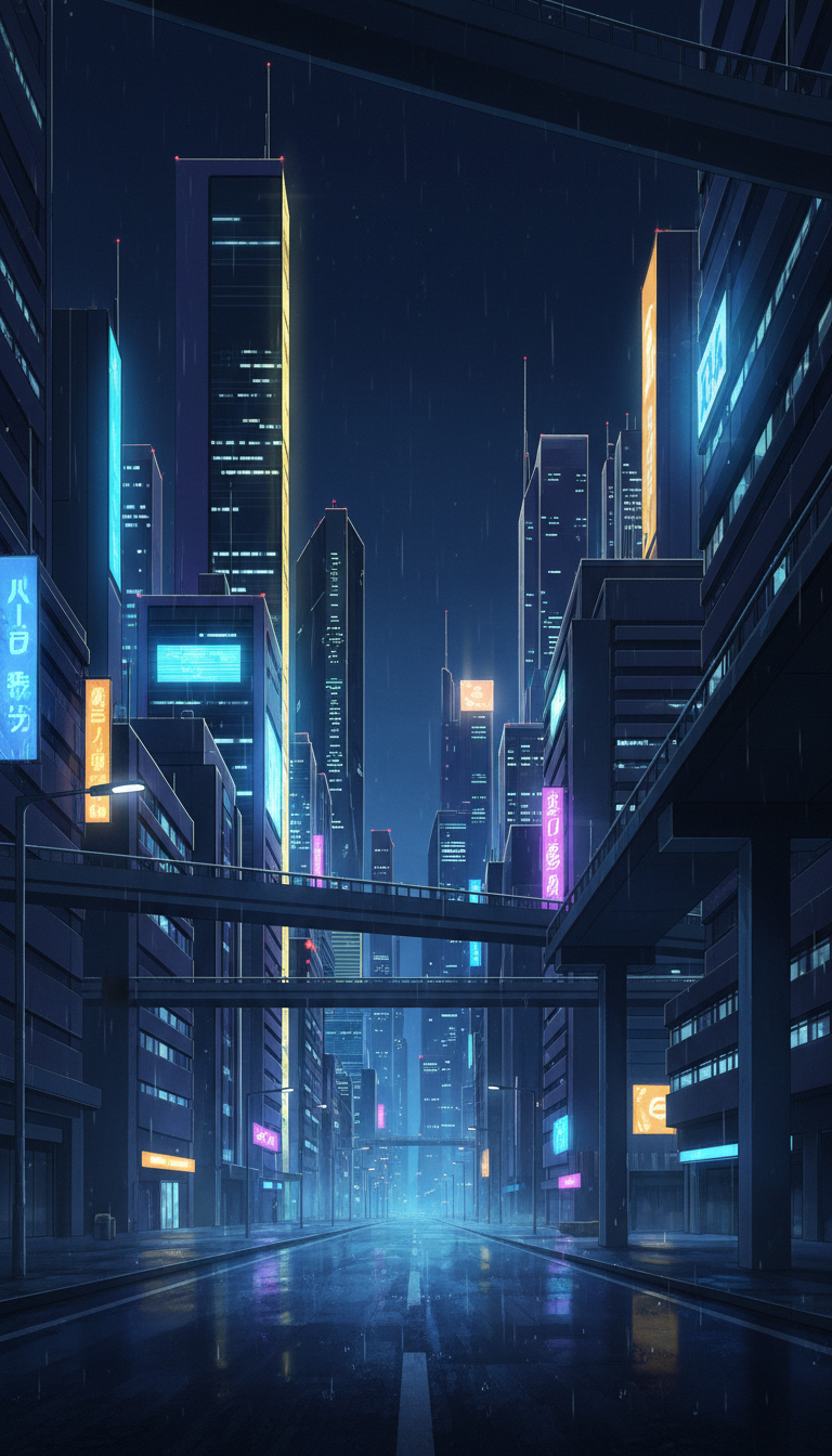 降雨で反射する看板光と無人の道路が、サイバーパンクな雰囲気を演出します。