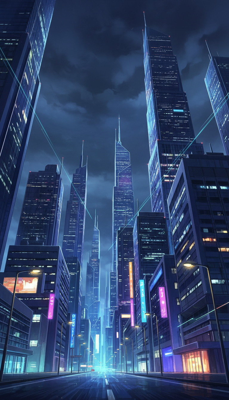近未来メガストリート夜景|消失点へ集約する光のライン