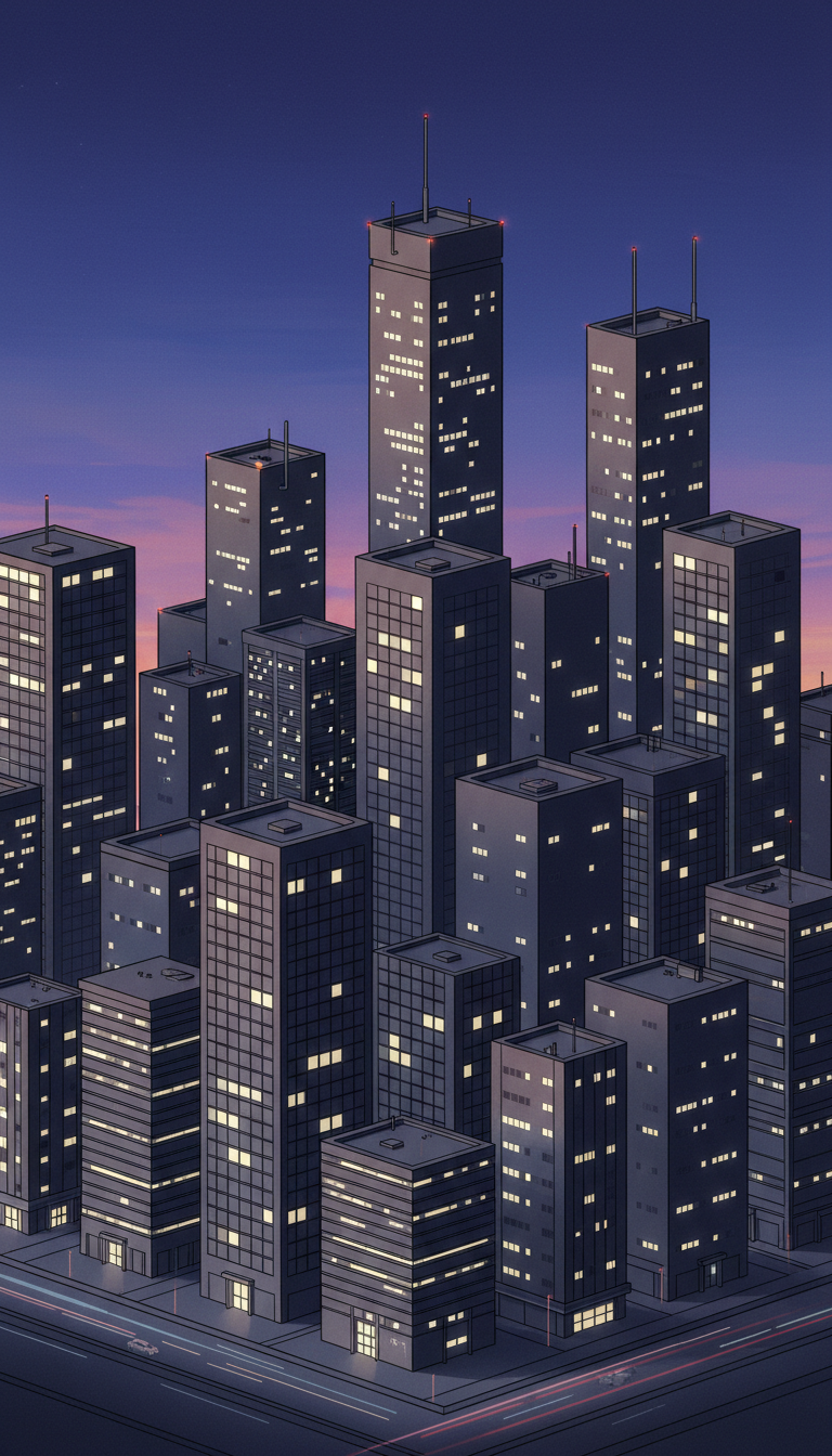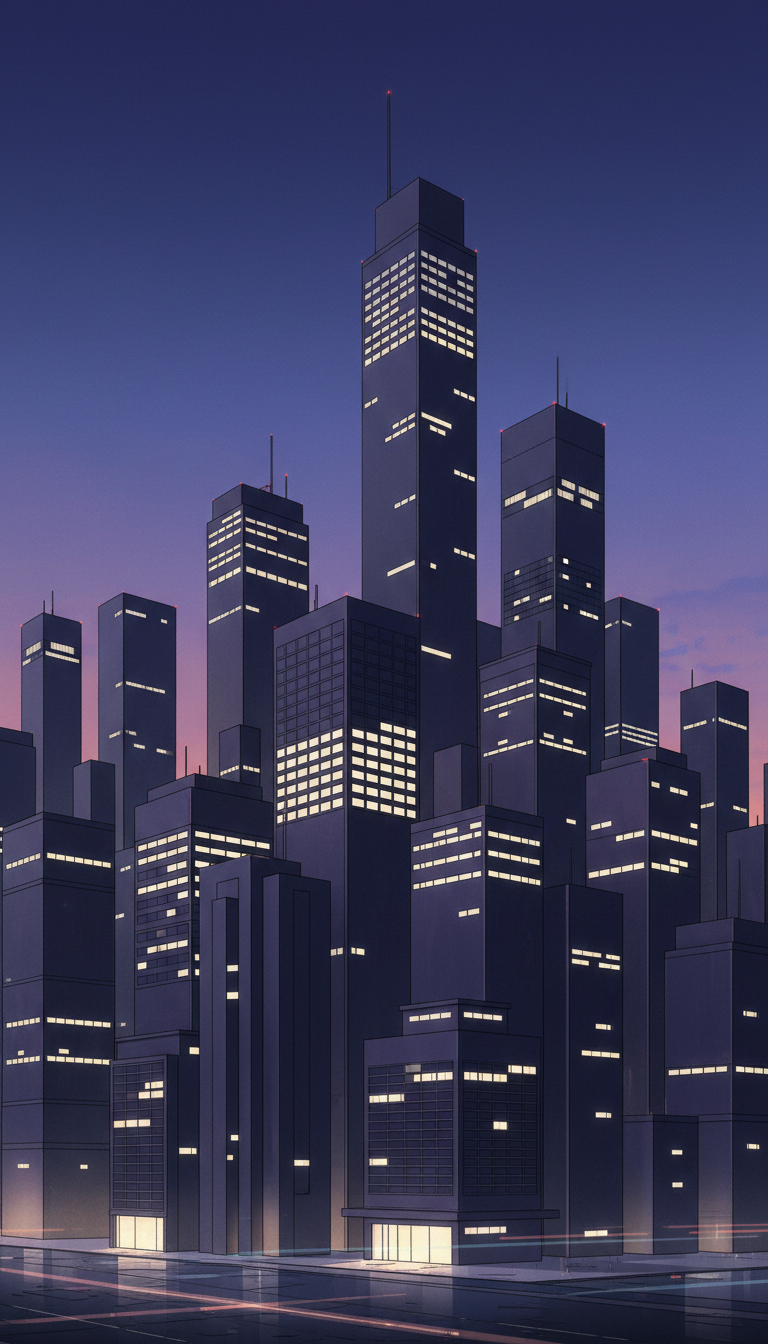 アニメ調ビル群の夜景イラスト|黄昏グラデーションと点灯窓