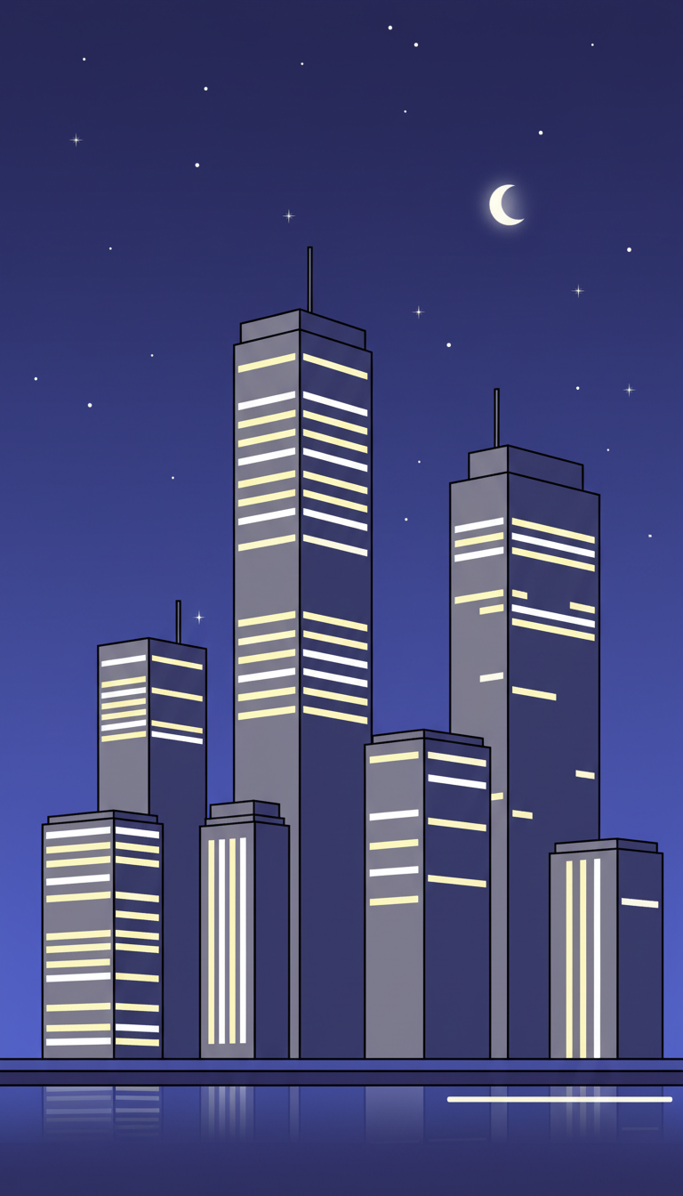 少ない色数と幾何学的シルエットで、スタイリッシュな夜景デザインを表現します。