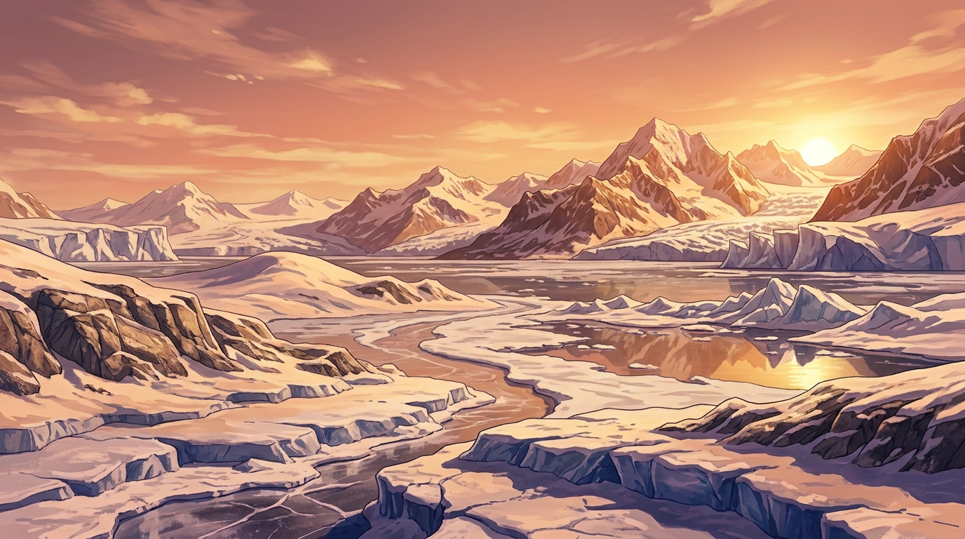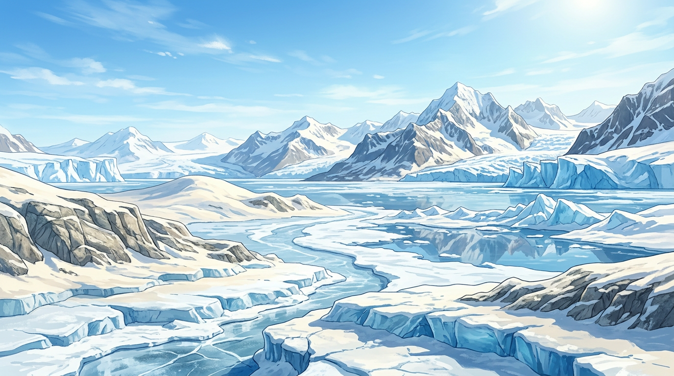 白い氷原と遠景の山並みが映える北極の広角背景イラストです。