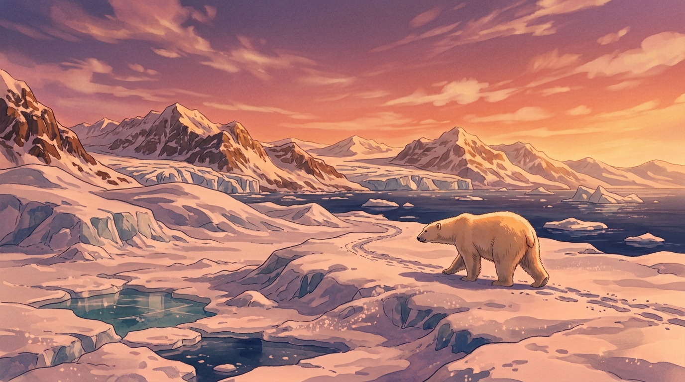 夕焼けの北極海岸とホッキョクグマ|北極背景イラスト素材