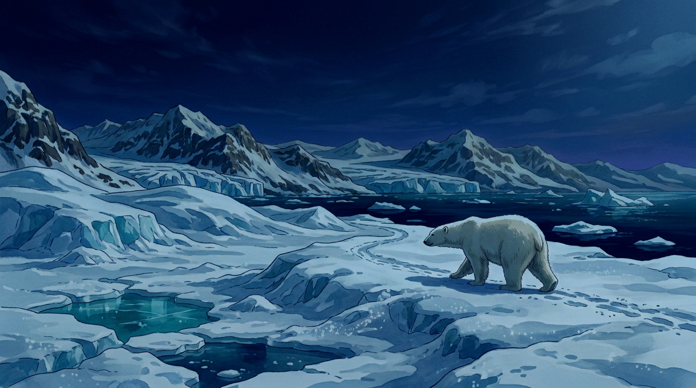 深い青の夜空と氷原の静けさを描いたホッキョクグマ入り背景イラストです。