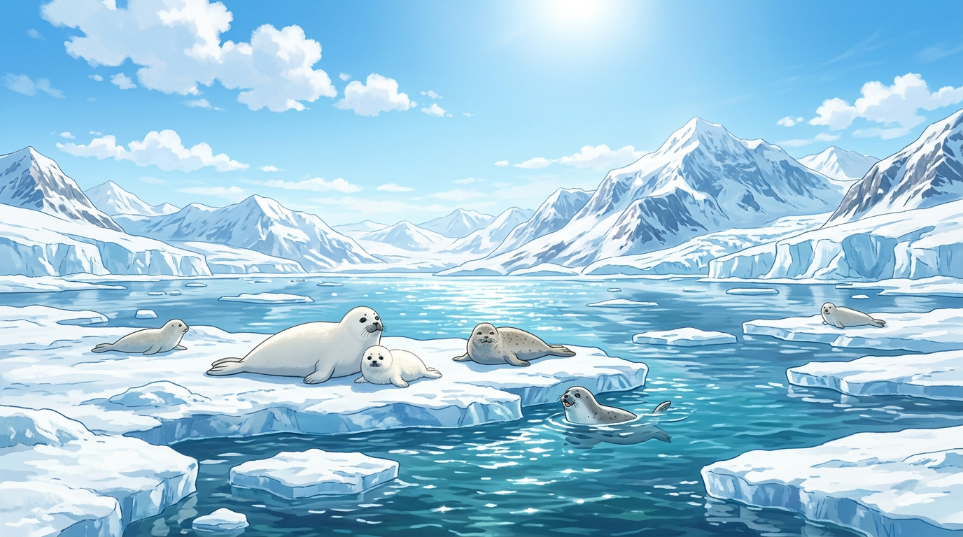 流氷の海とアザラシたちの群れ|北極背景イラスト素材