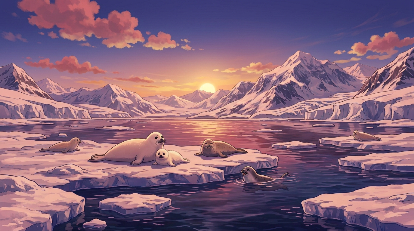 夕暮れの流氷とアザラシたち|北極背景イラスト素材