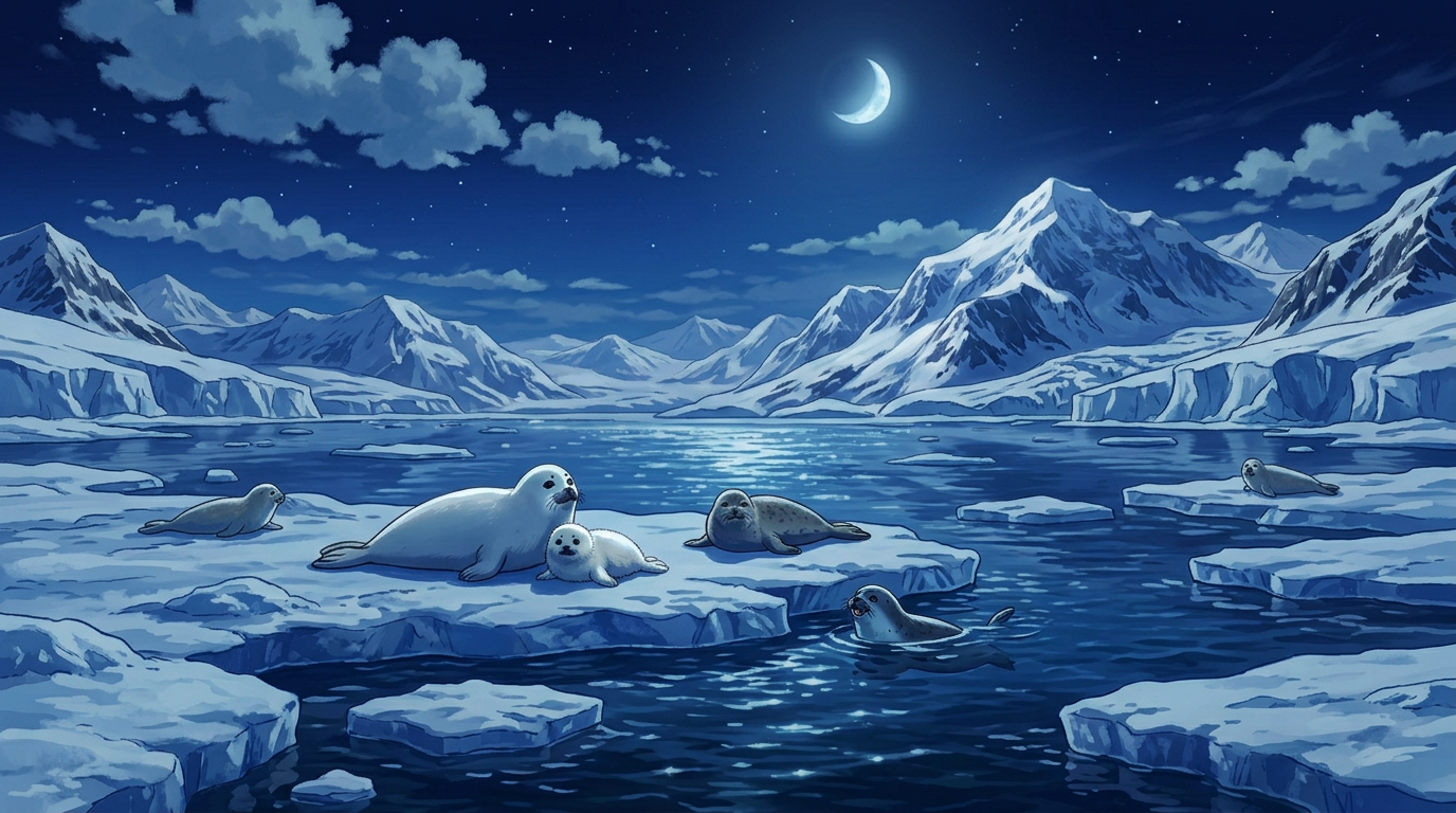 月夜の流氷とアザラシたち|北極背景イラスト素材