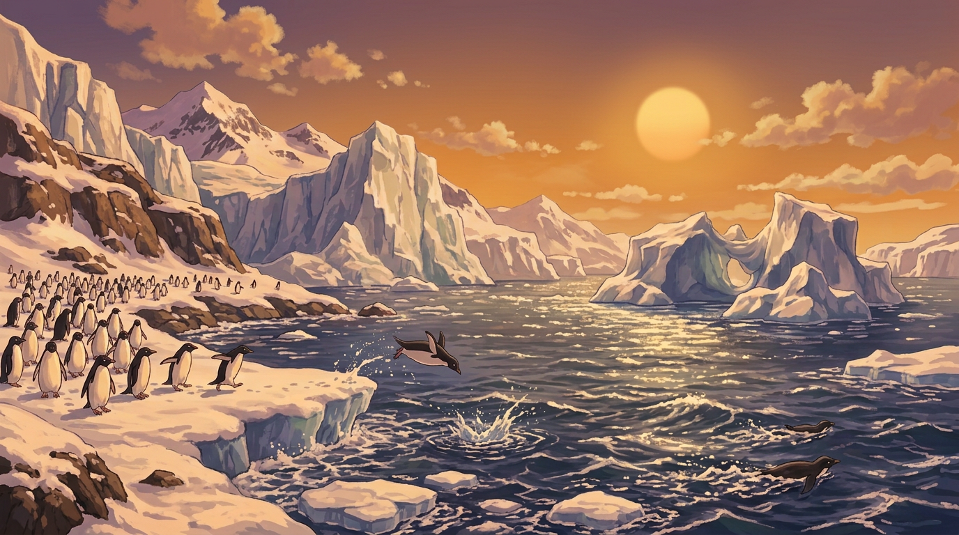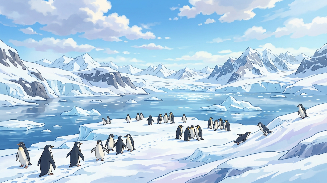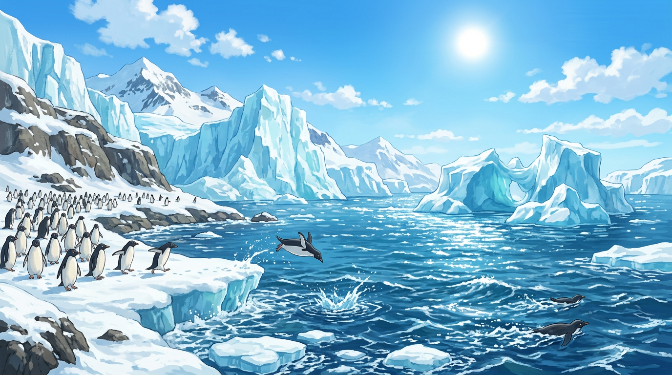 流氷の海とペンギンの群れが集う南極湾|南極背景イラスト素材