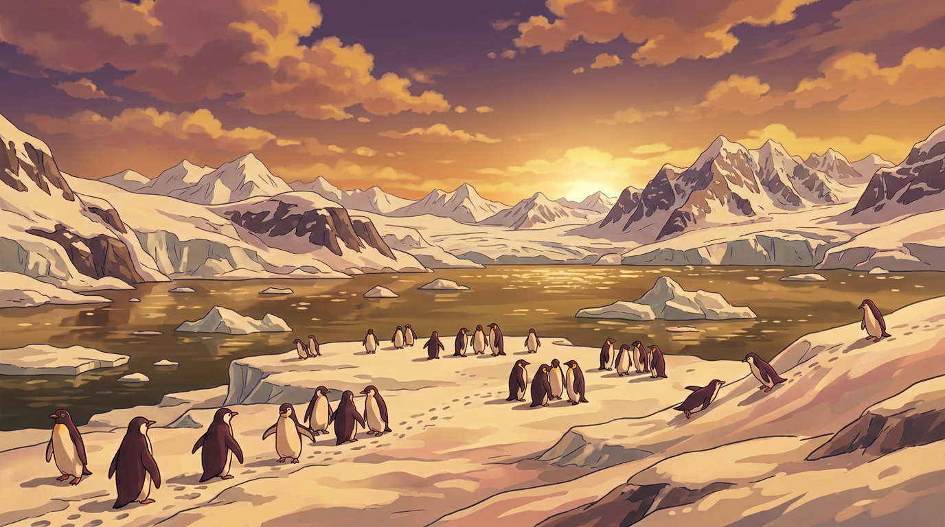 夕焼けの南極湾とペンギンの群れ|南極背景イラスト素材