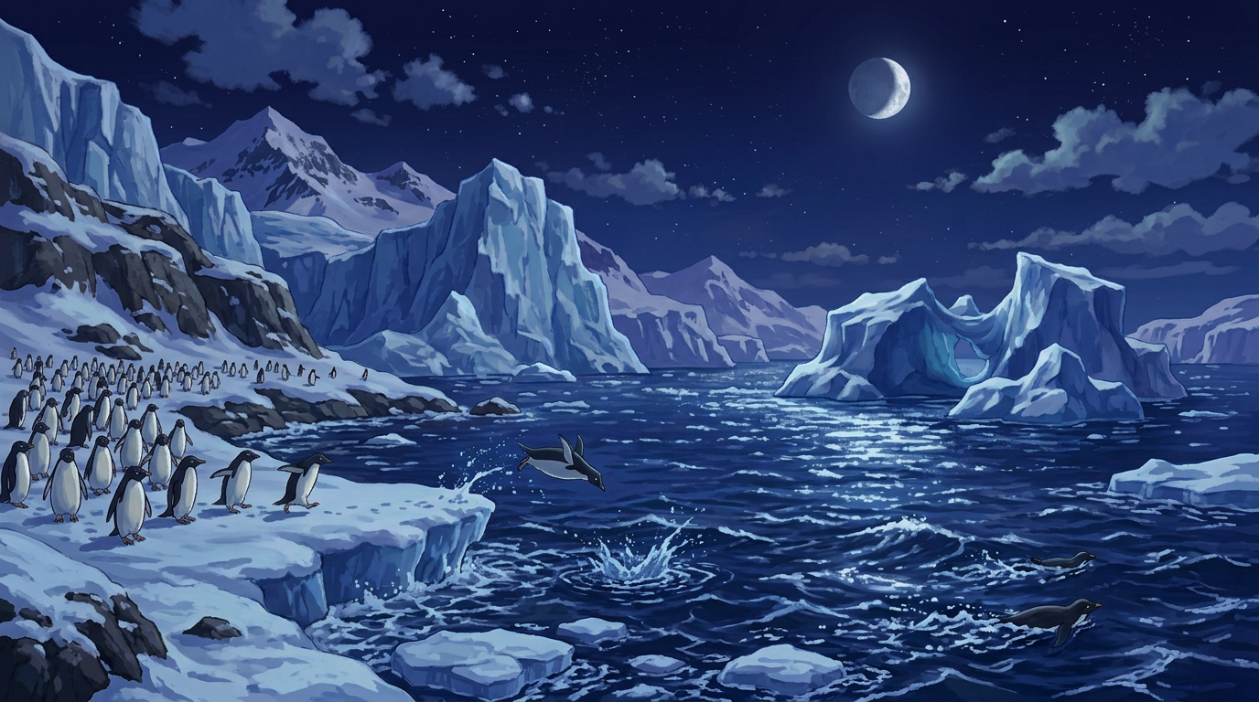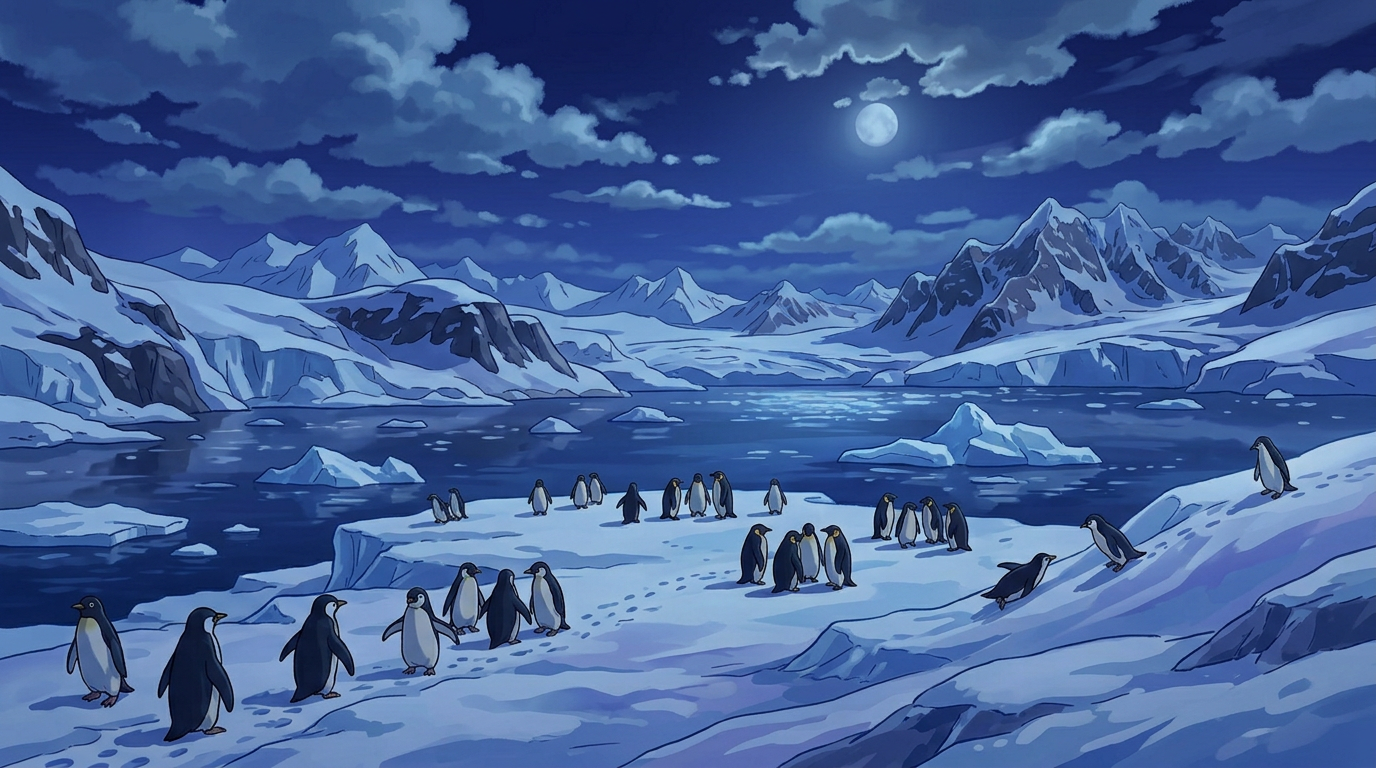 月夜の南極湾とペンギンの群れ|南極背景イラスト素材