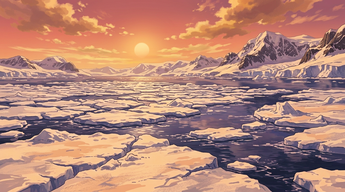 夕焼けの流氷原と南極の海|南極背景イラスト素材
