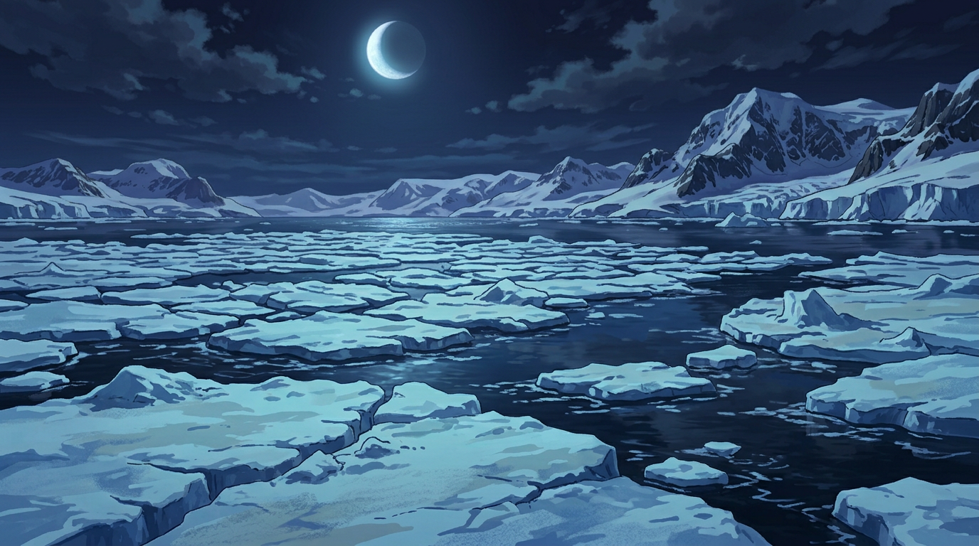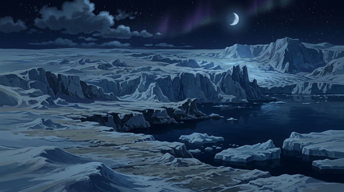 三日月に照らされた静かな流氷と海を描いた夜景の背景素材です。