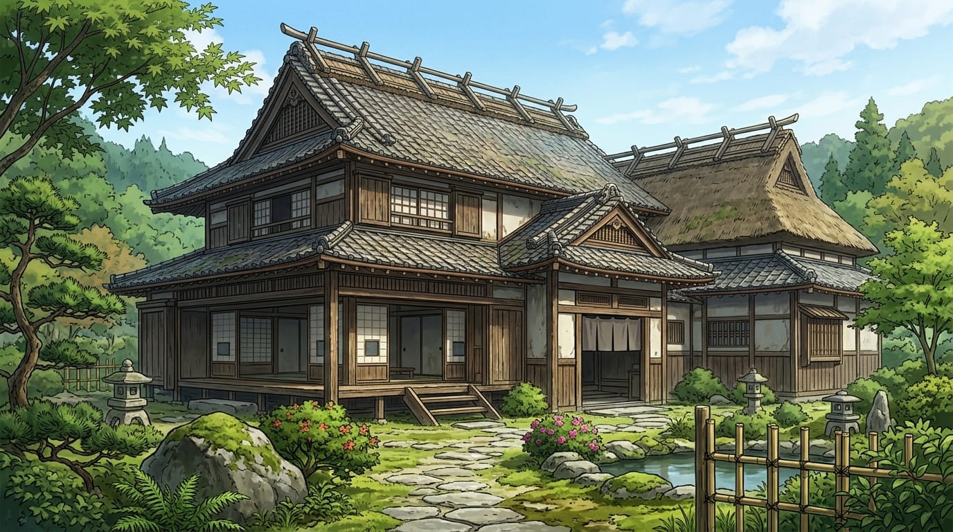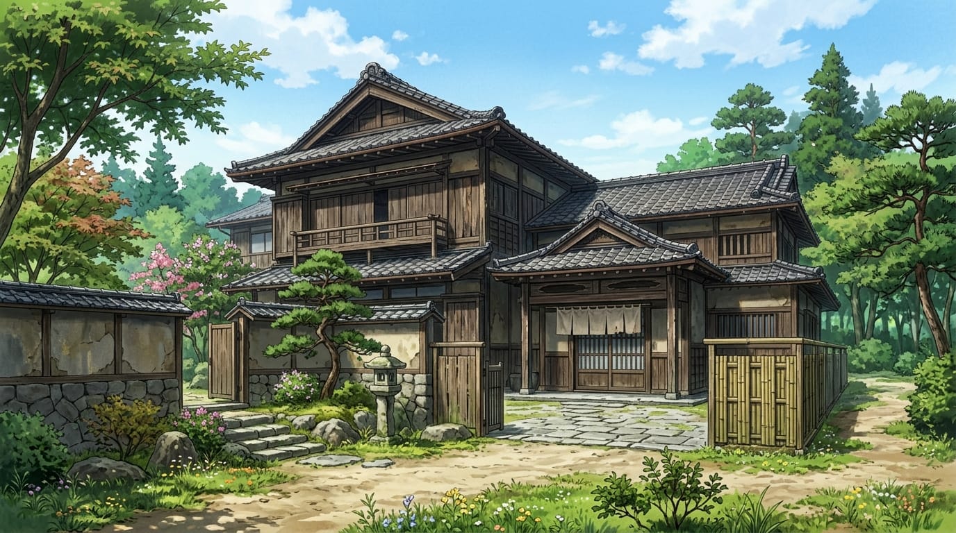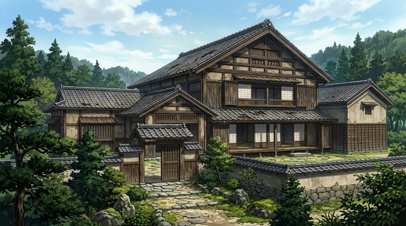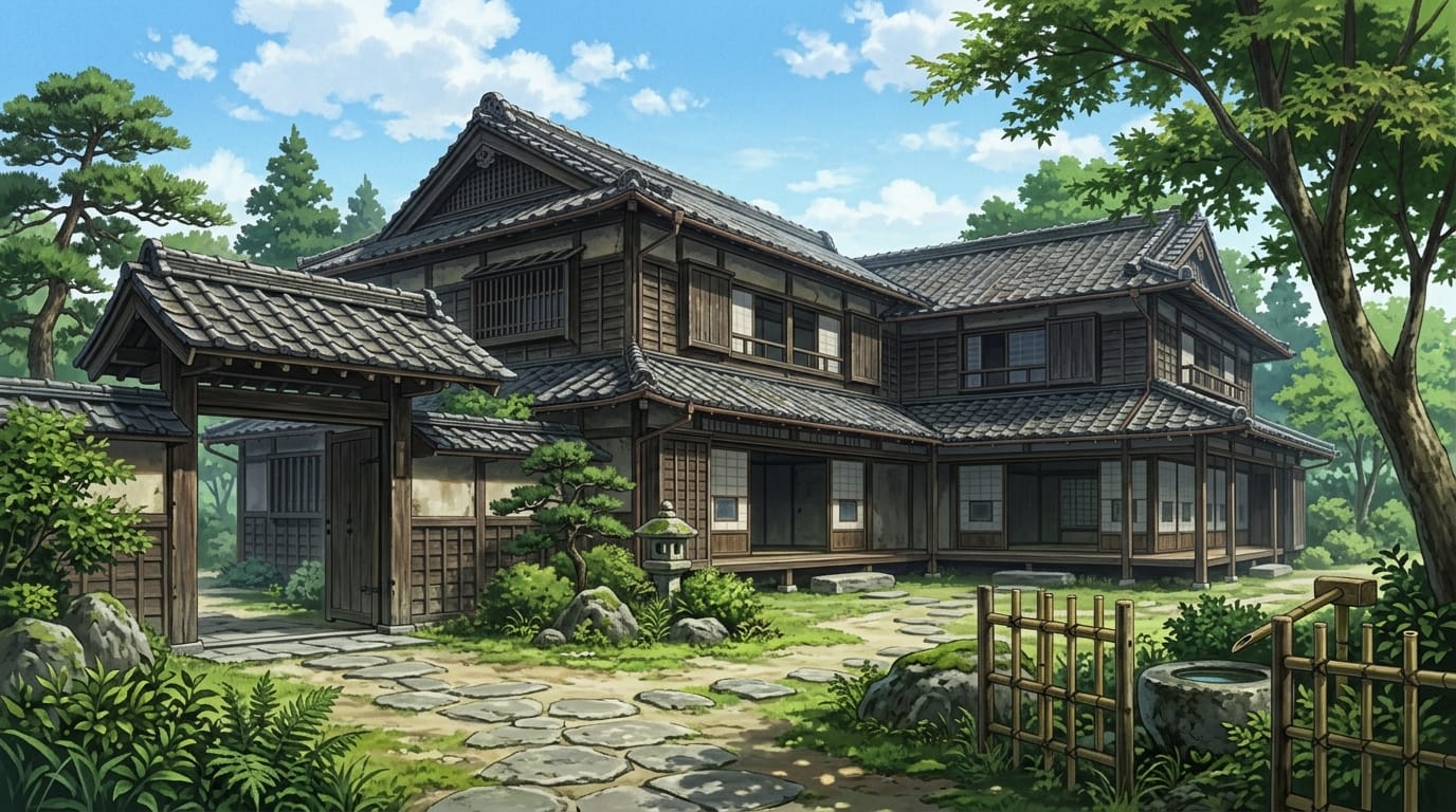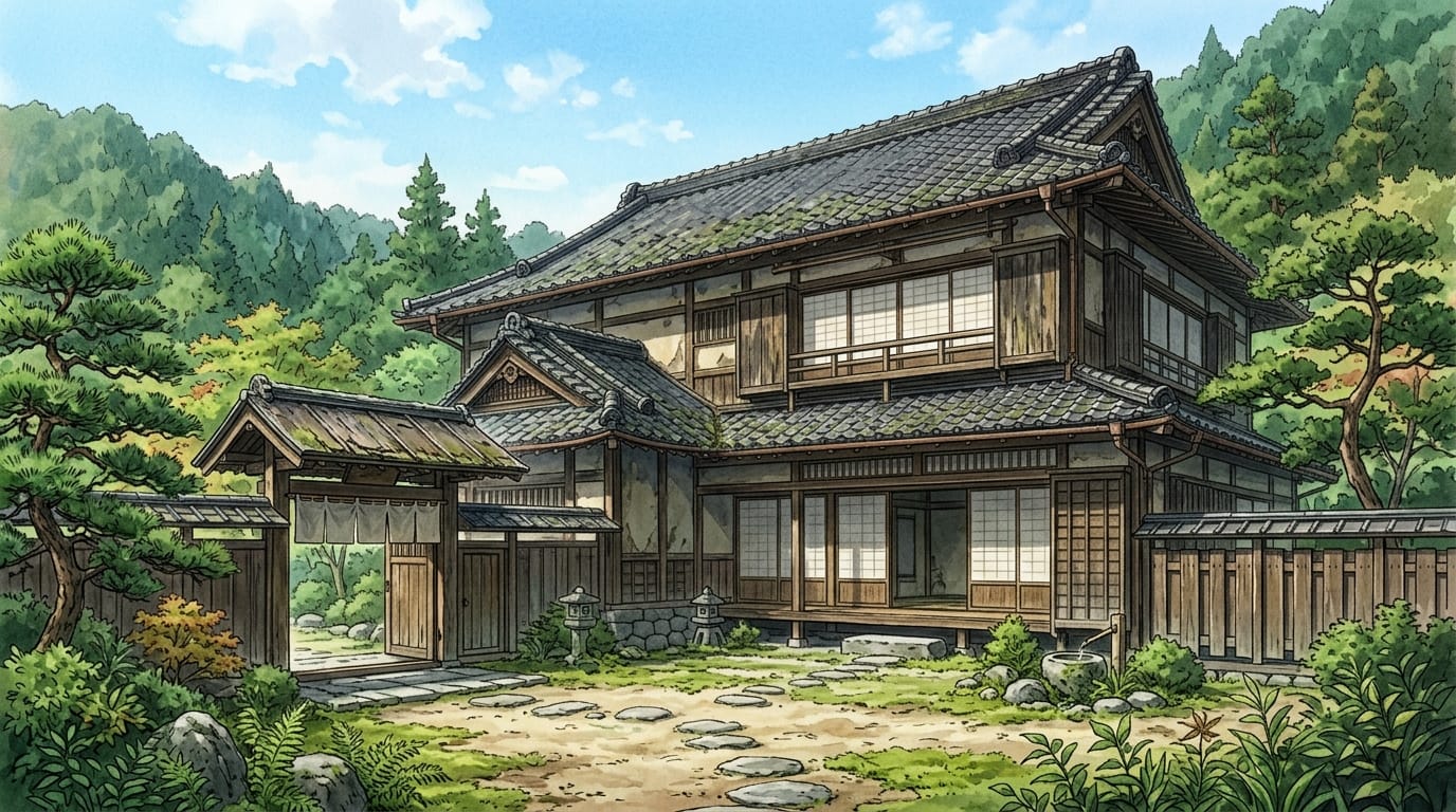 広い敷地に建つ古びた和風屋敷|和風邸宅の背景イラスト素材