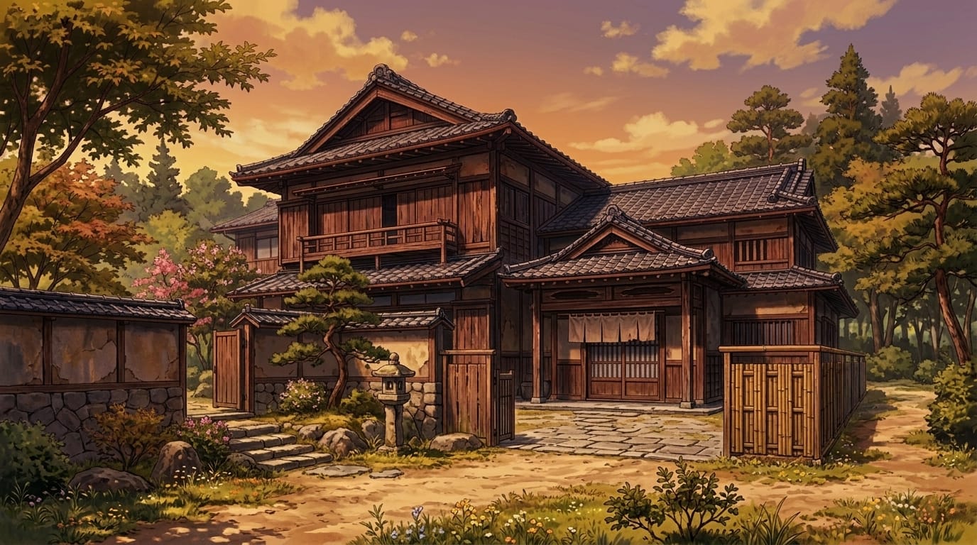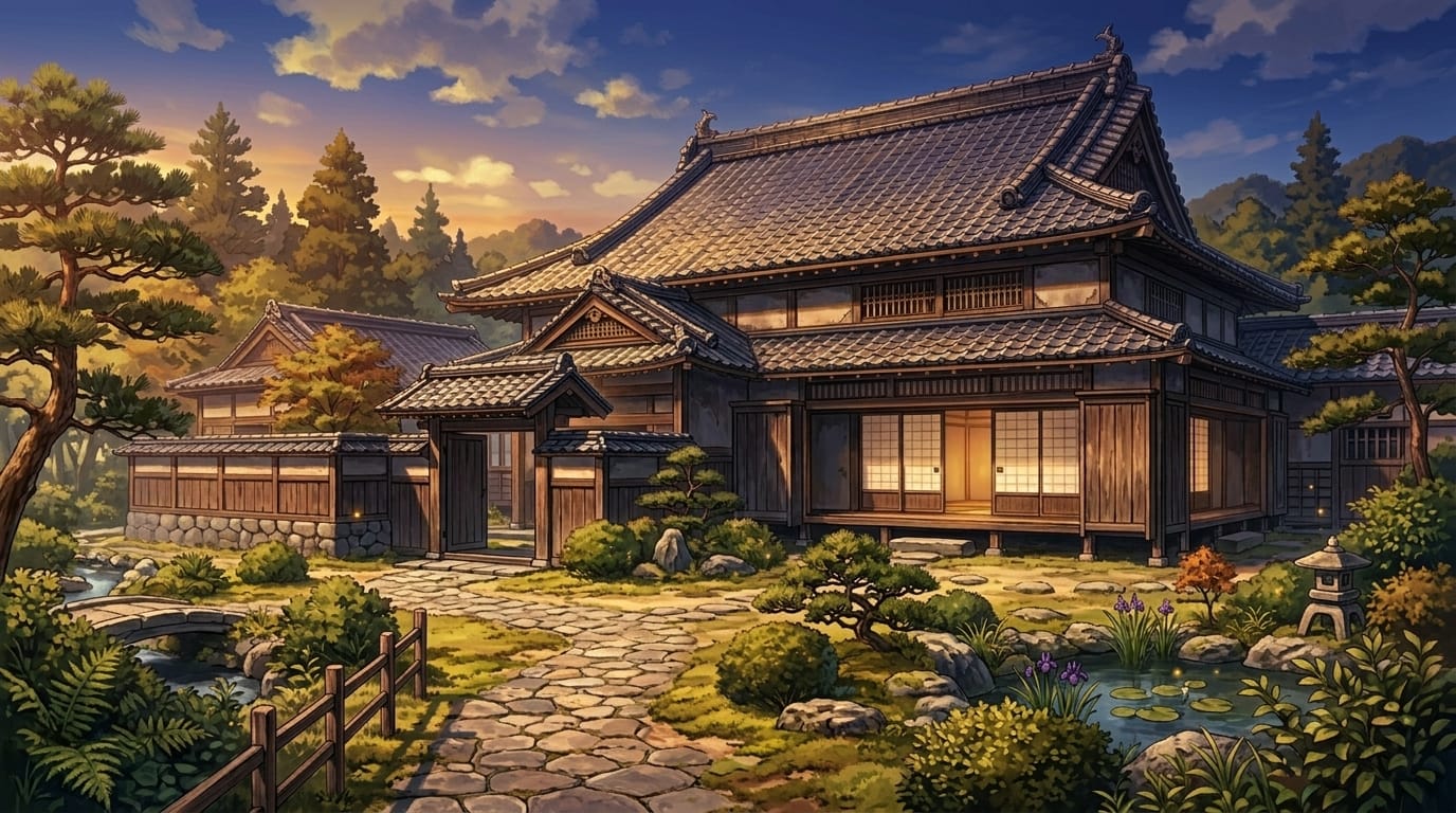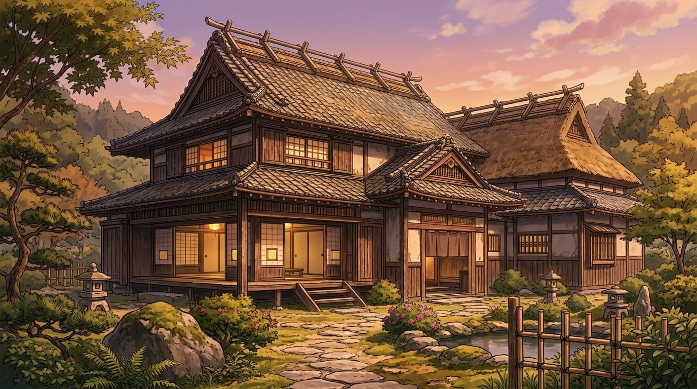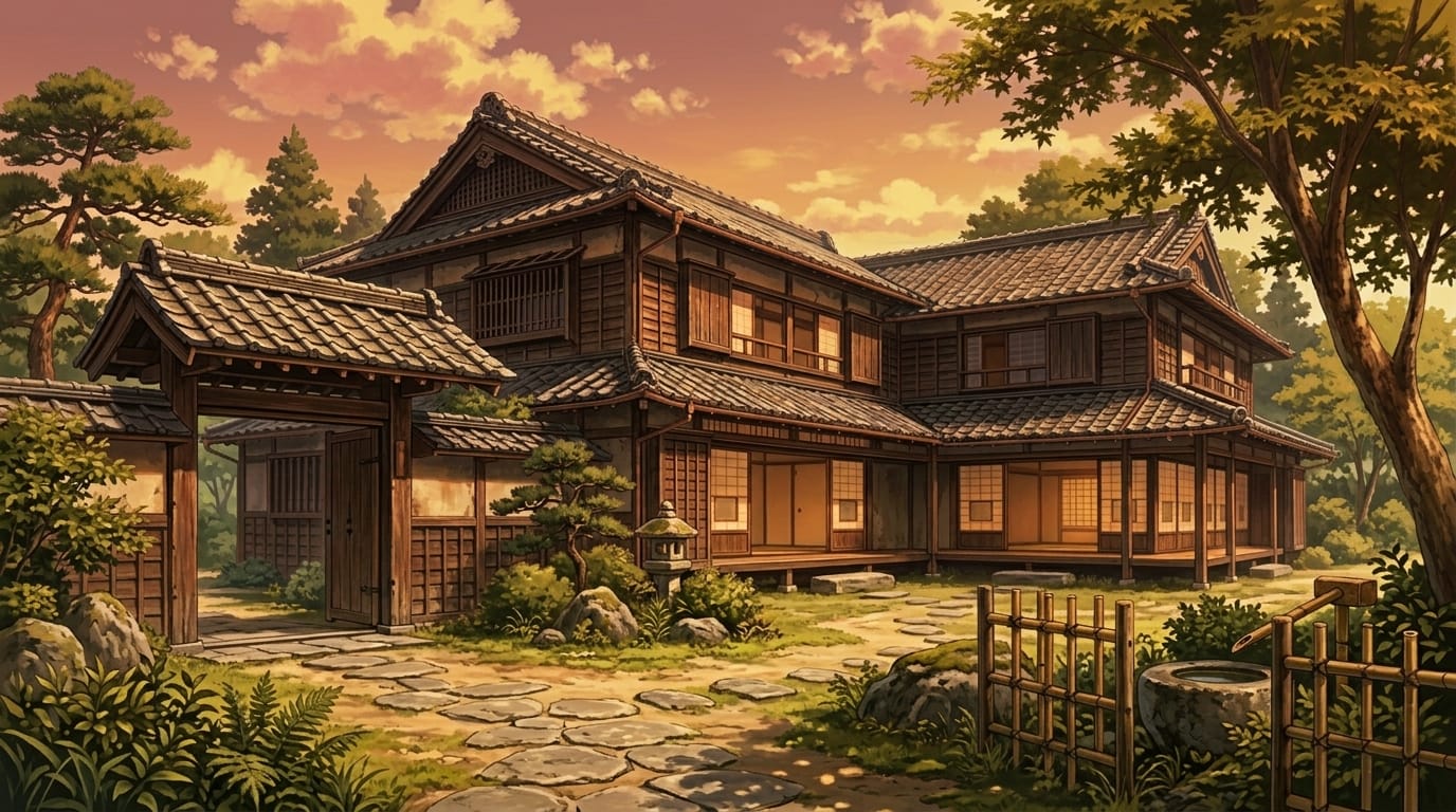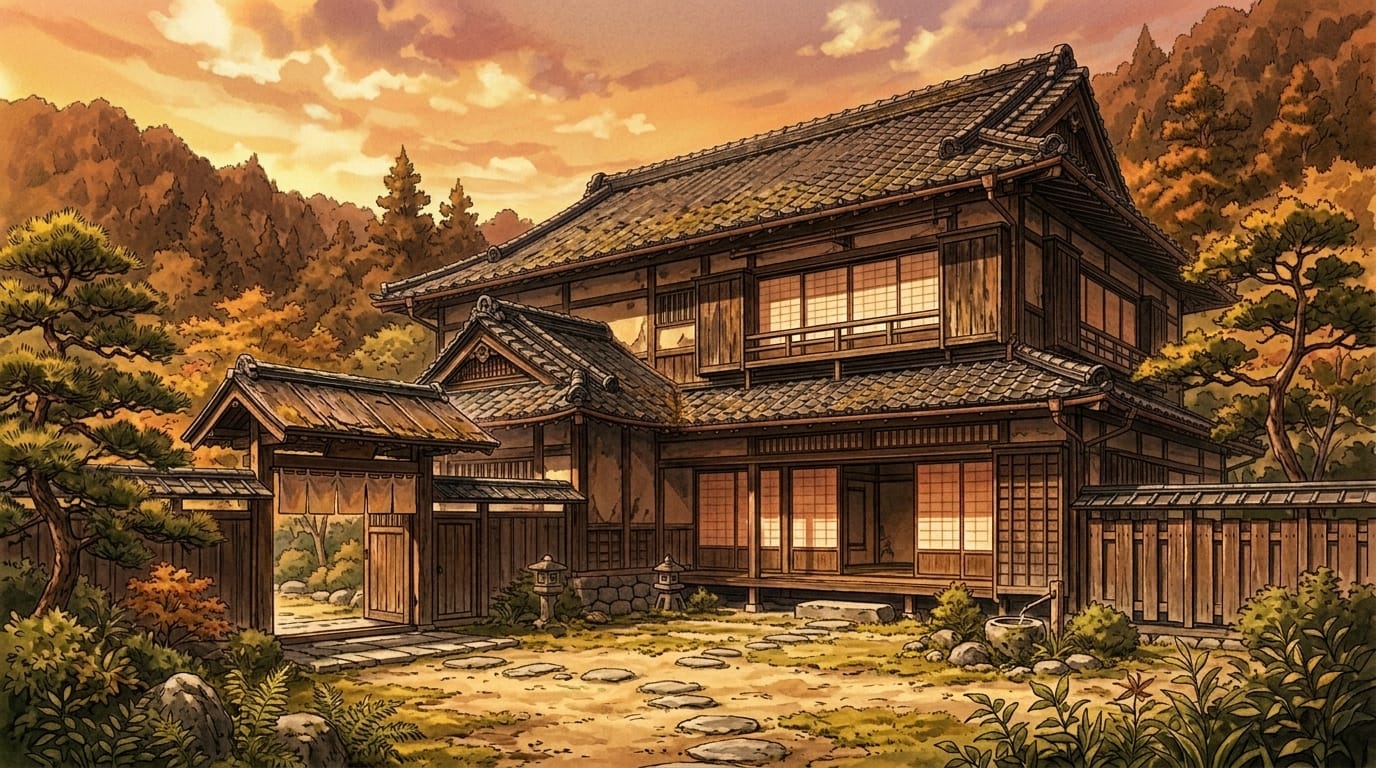 夕空のやわらかな光に照らされた古びた和風屋敷で、物語性のある和風背景として活用できます。