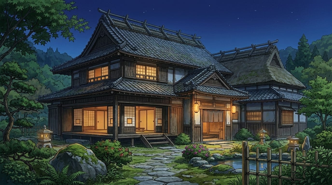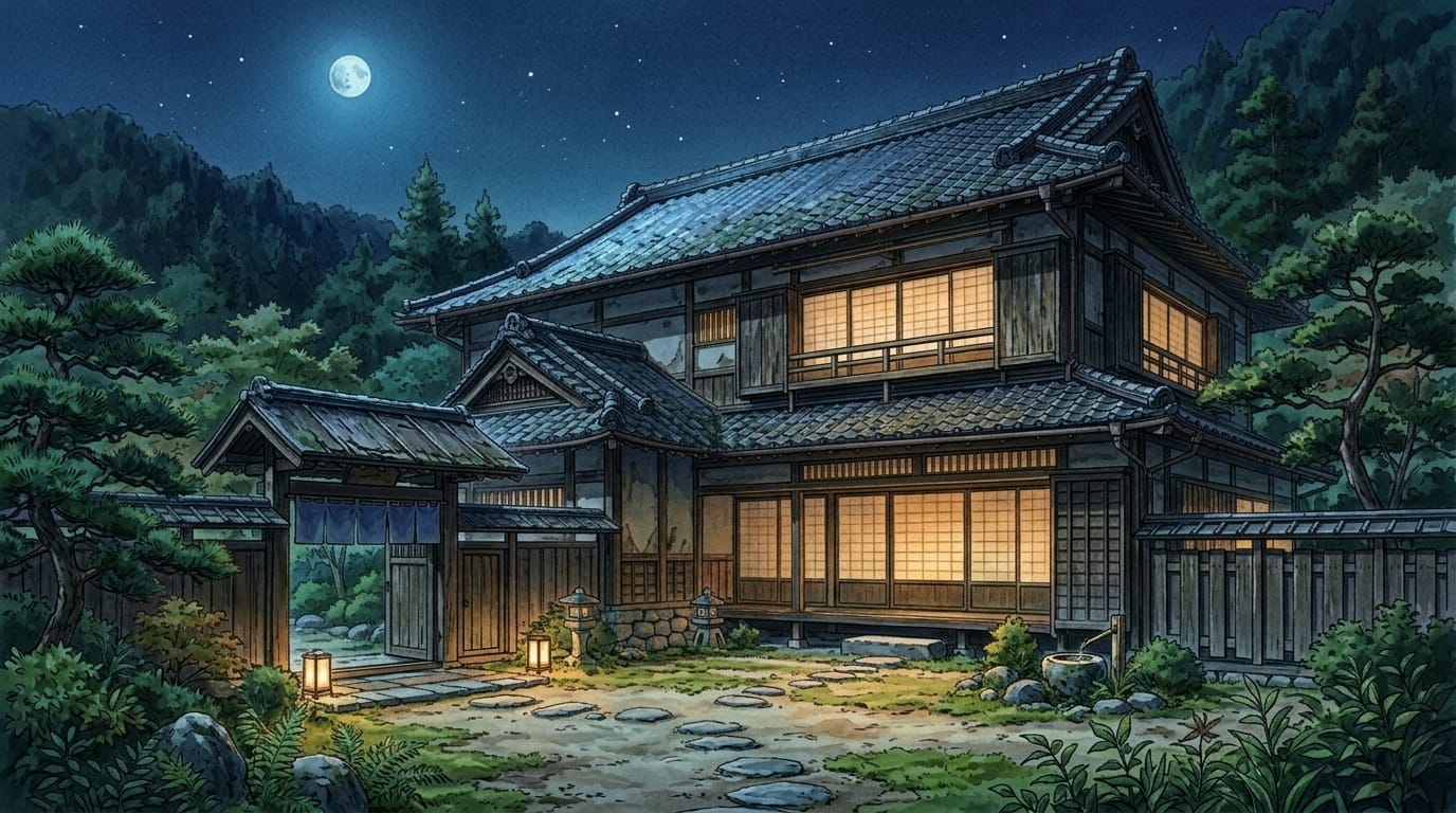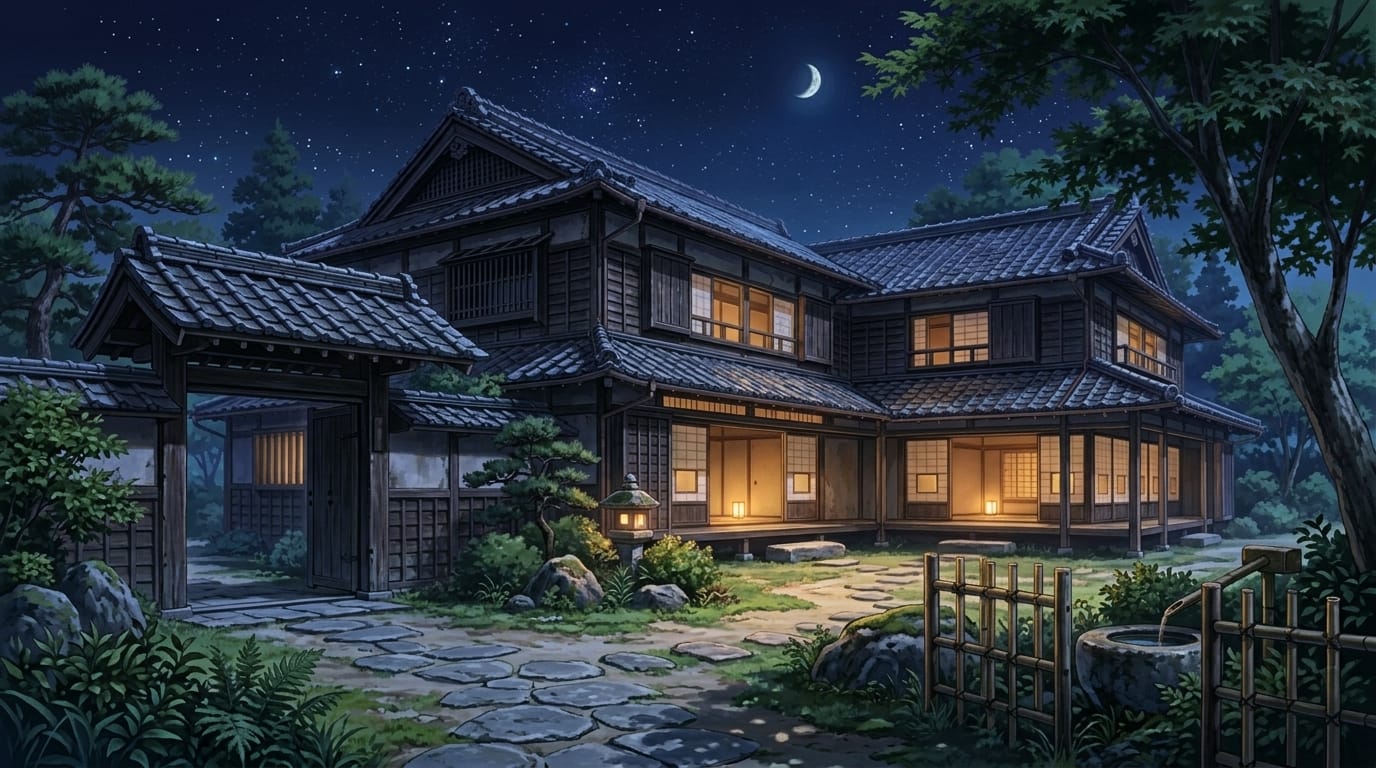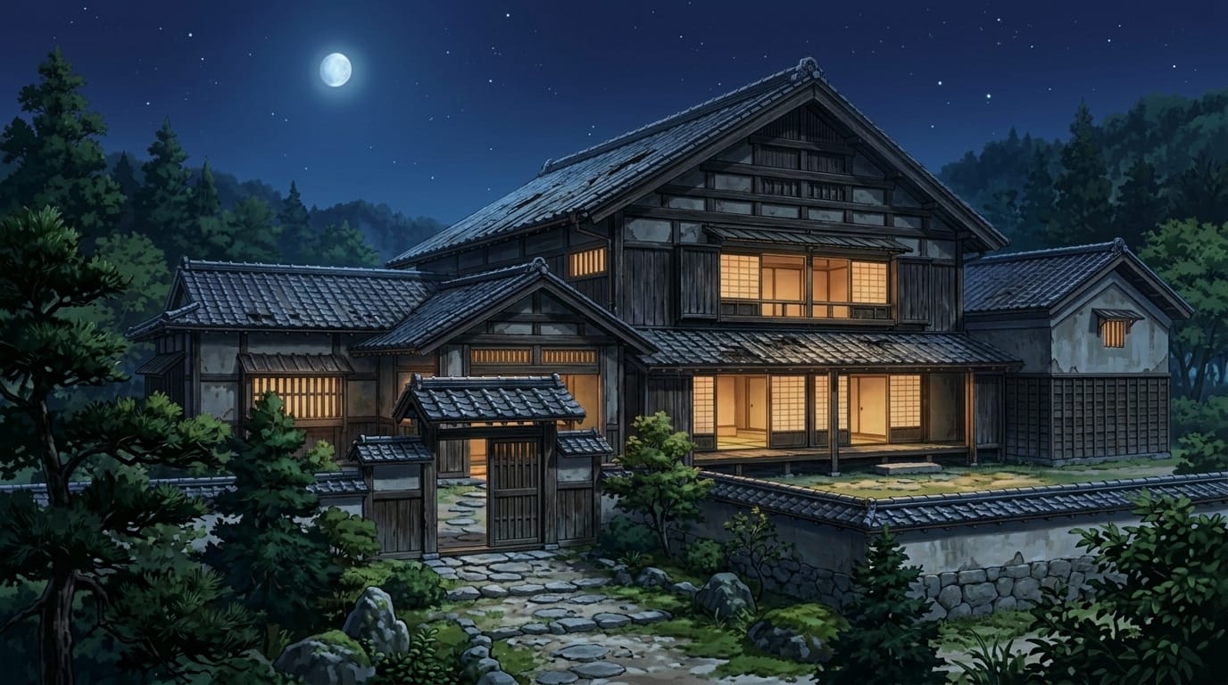 夜の灯りがともる古びた和風屋敷|和風住宅の背景イラスト素材
