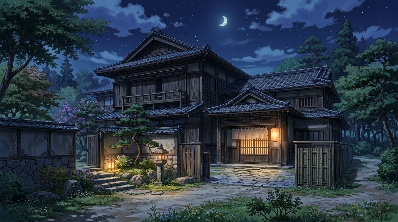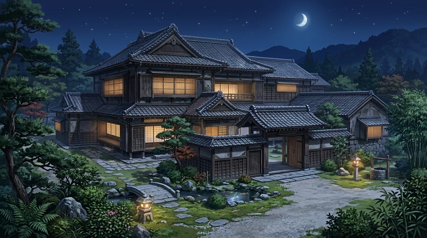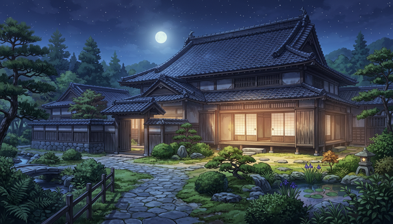 月夜の庭園に佇む古びた和風邸宅|和風邸宅の背景イラスト素材