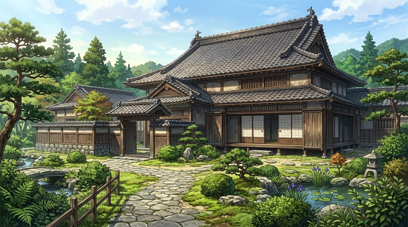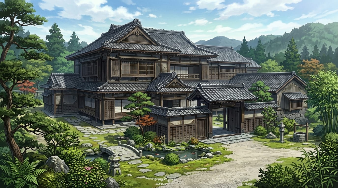 門や池、小橋を備えた広い敷地の和風屋敷を描いた、上質感のある背景表現に向いた素材です。