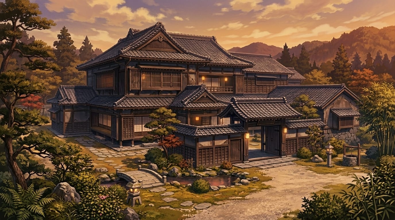 山並みを背にした大きな和風邸宅を夕景で描いた、重厚感と風情のある背景素材です。