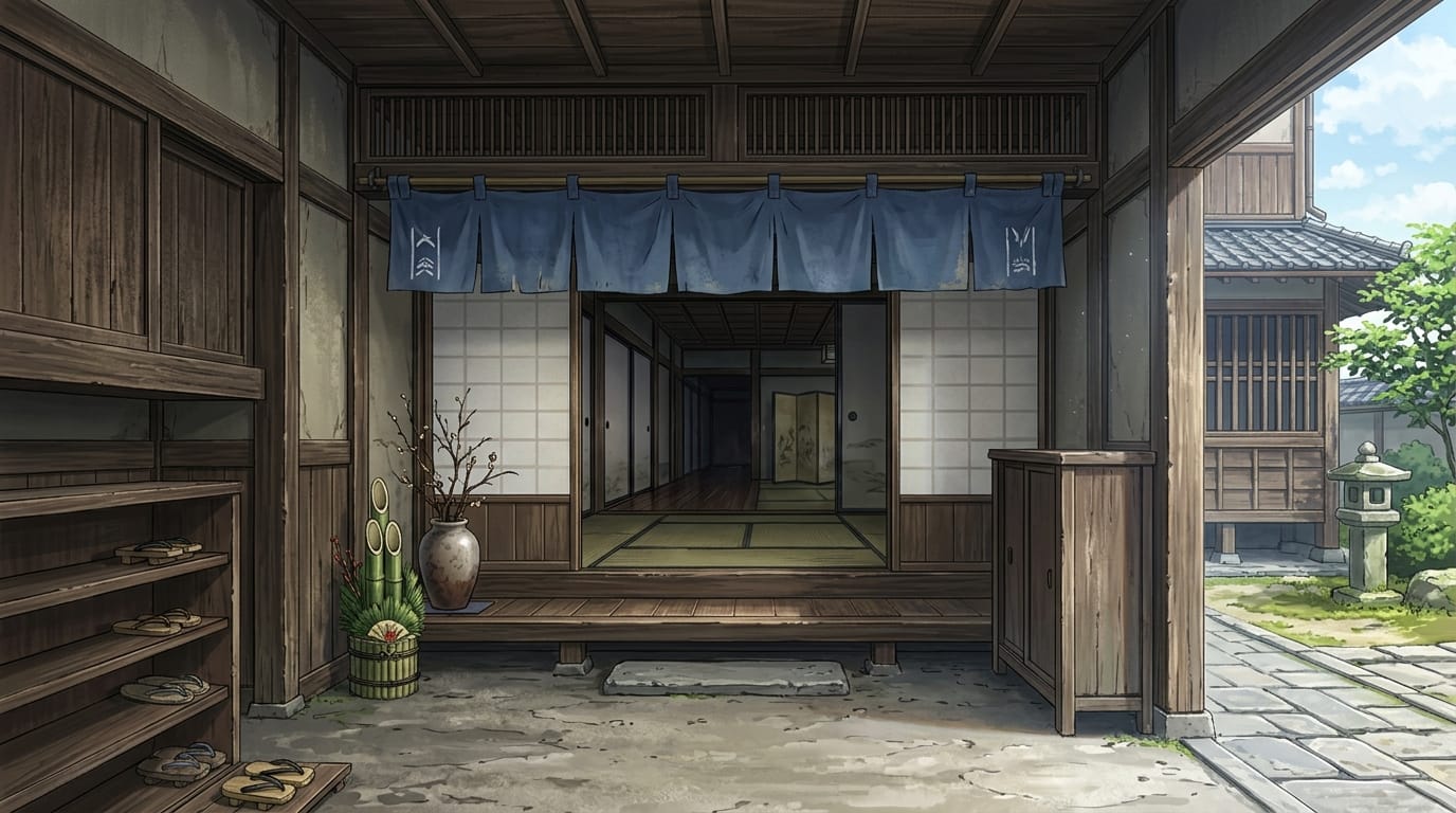 下駄箱や暖簾、畳廊下が並ぶ古びた和風屋敷の玄関空間を表現した、室内演出向けの背景素材です。