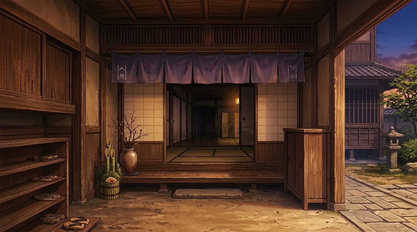 夕暮れに染まる古びた和風屋敷の玄関|和風室内の背景イラスト素材