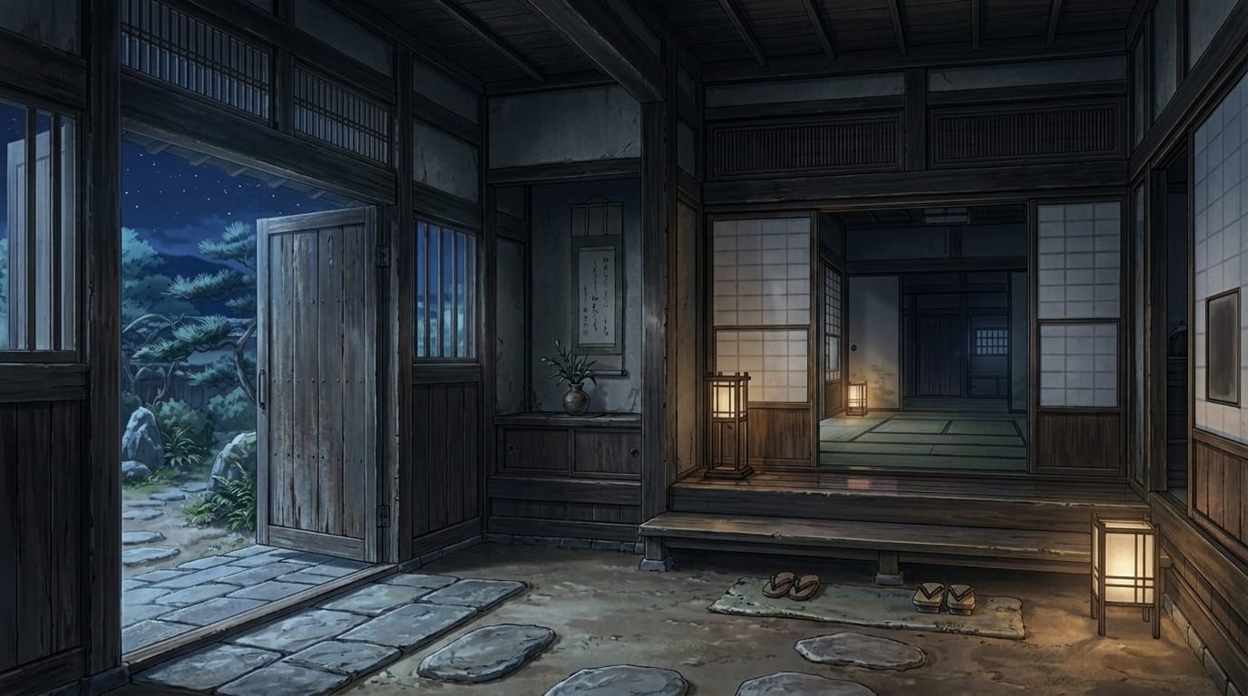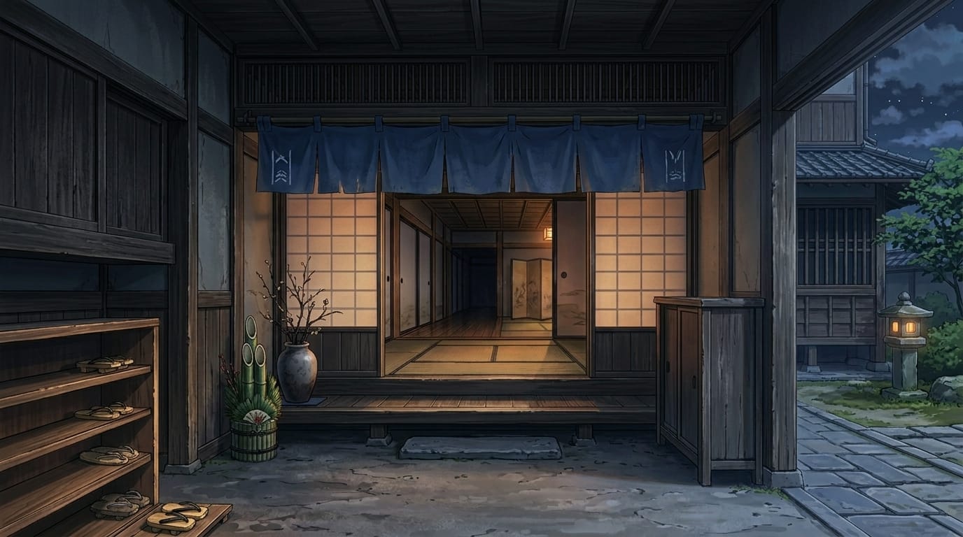 夜の灯りが映える古びた和風屋敷の玄関|和風室内の背景イラスト素材