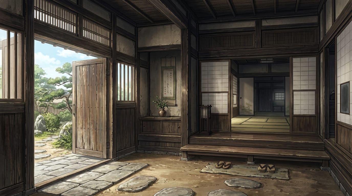 庭へ続く木戸と畳廊下が趣を添える古びた和風屋敷の玄関空間を描いた背景素材です。